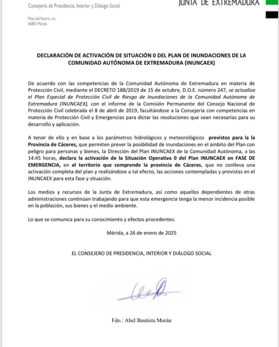 Fase de Emergencia en Situación Operativa 0 para la Provincia de Cáceres2025-01-26 17:53:00Info GeneralBuenas tardes vecinos.