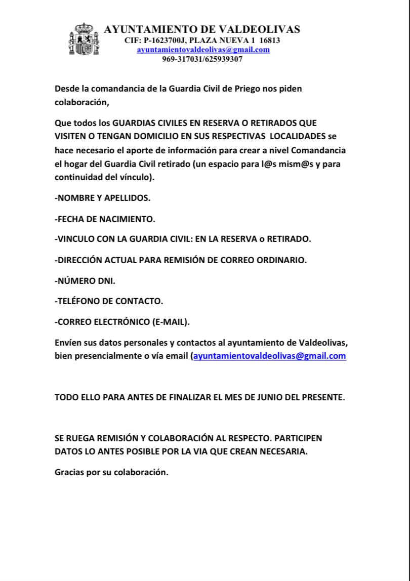 Que todos los GUARDIAS CIVILES EN RESERVA O RETIRADOS QUE VISITEN O TENGAN DOMICILIO EN SUS RESPECTIVAS LOCALIDADES se hace necesario el aporte de información para crear a nivel Comandancia el hogar del Guardia Civil retirado (un espacio para l@s mism@s y para continuidad del vínculo).