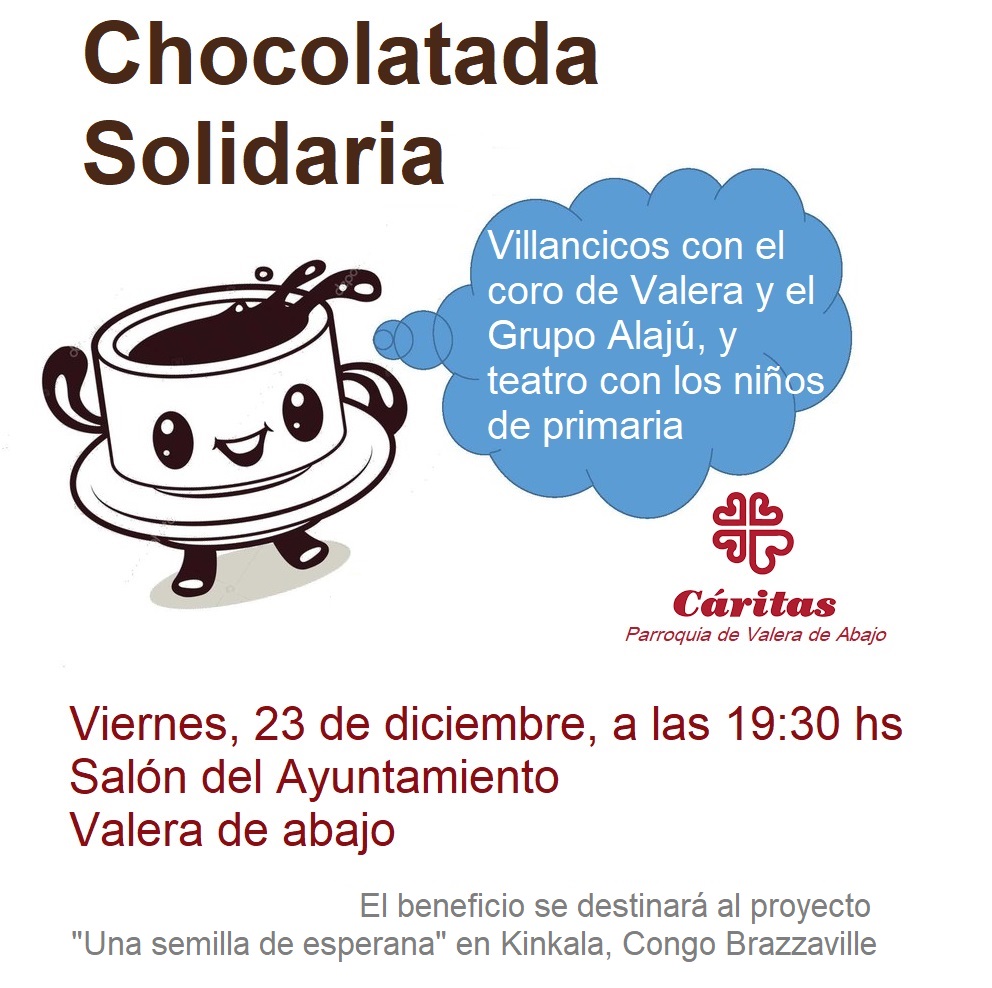 Chocolatada solidaria este Viernes2022-12-20 20:21:48Info GeneralEste viernes, 23 de diciembre, a las 19.30 hs en el salón del baile del ayuntamiento, chocolatada solidaria de Cáritas parroquial. Villancicos con el coro de Valera y el Grupo Alajú de Villaverde, y teatro con los niños de primaria. 2€ por chocolate que se destinarán a un proyecto en Congo.