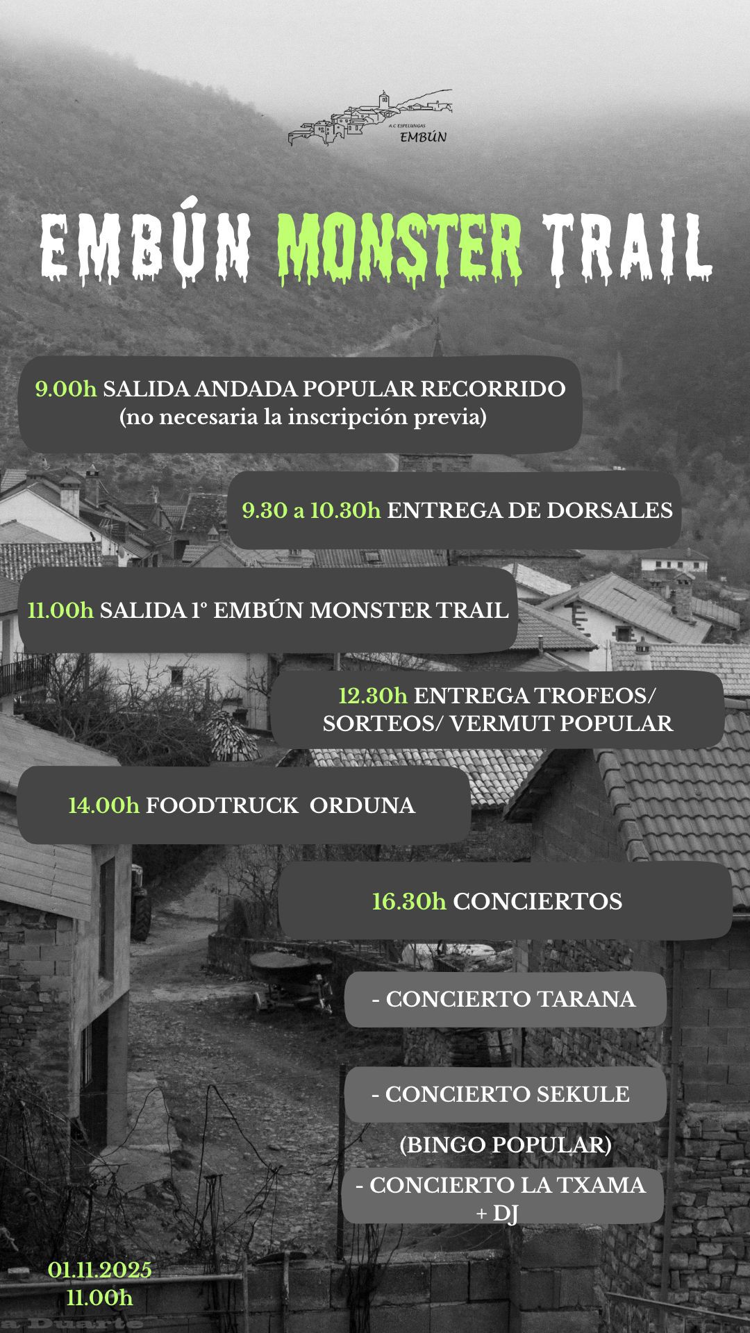 Se adjunta cartel informativo sobre la celebración de la carrera "Embún Monster Trail" y conciertos en Embún, el 1 de noviembre.