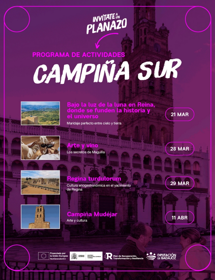 En este enlace se pueden inscribir al programa de las siete experiencias donde pueden reservar cada una de ellas y el cartel de la actividad de Campiña Mudéjar donde visitamos Valverde de Llerena, Azuaga y Granja de Torrehermosa el 11 de abril por la mañana.