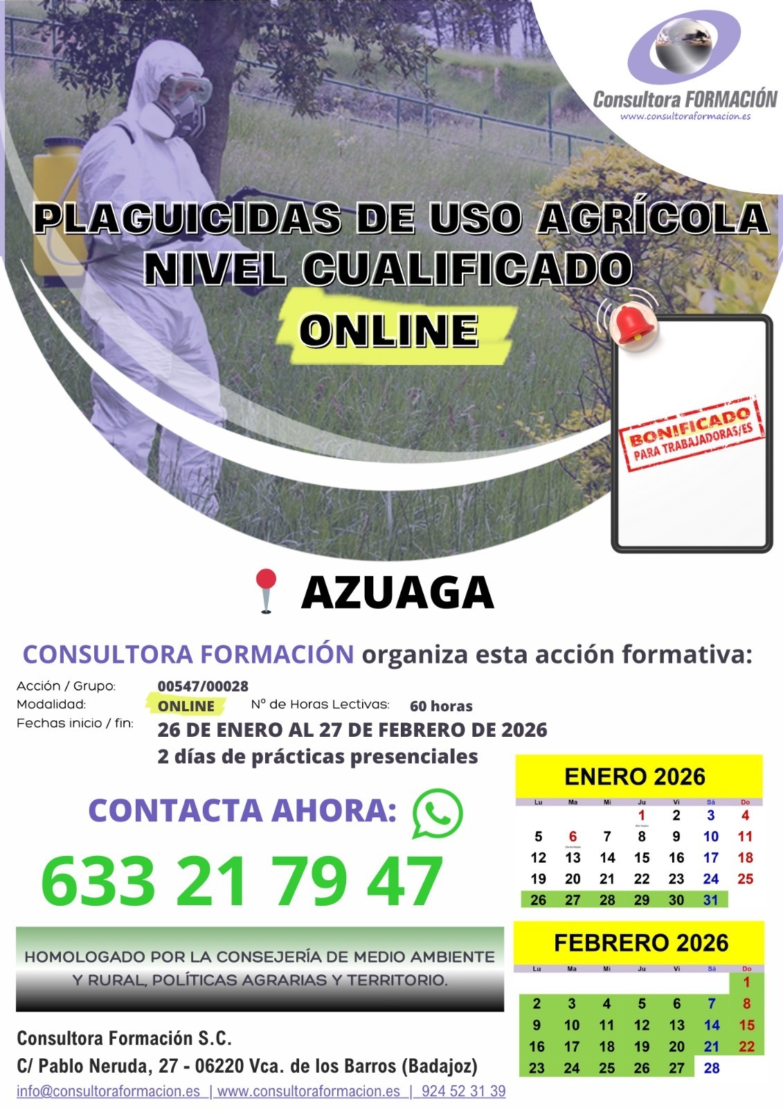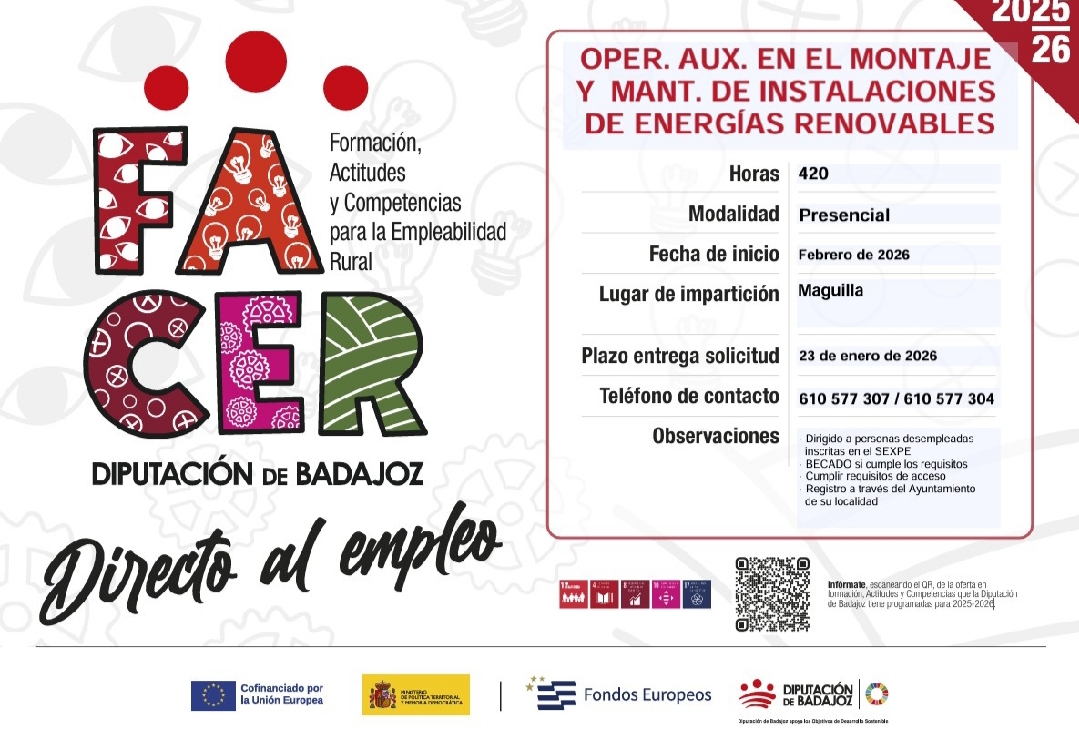 Desde el Proyecto FACER de la Diputación de Badajoz se anuncia la acción formativa "OPERACIONES BÁSICAS EN EL MONTAJE Y MANTENIMIENTO DE INSTALACIONES DE ENERGÍAS RENOVABLES”, dirigido al territorio CID Campiña sur y localidades cercanas.El curso se impartirá en la localidad de Maguilla el próximo mes de febrero de 2026.Esta formación está orientada a personas desempleadas, inscritas como demandantes de empleo y empadronadas en la provincia de Badajoz. Es gratuita y becada.El plazo para la p(...)