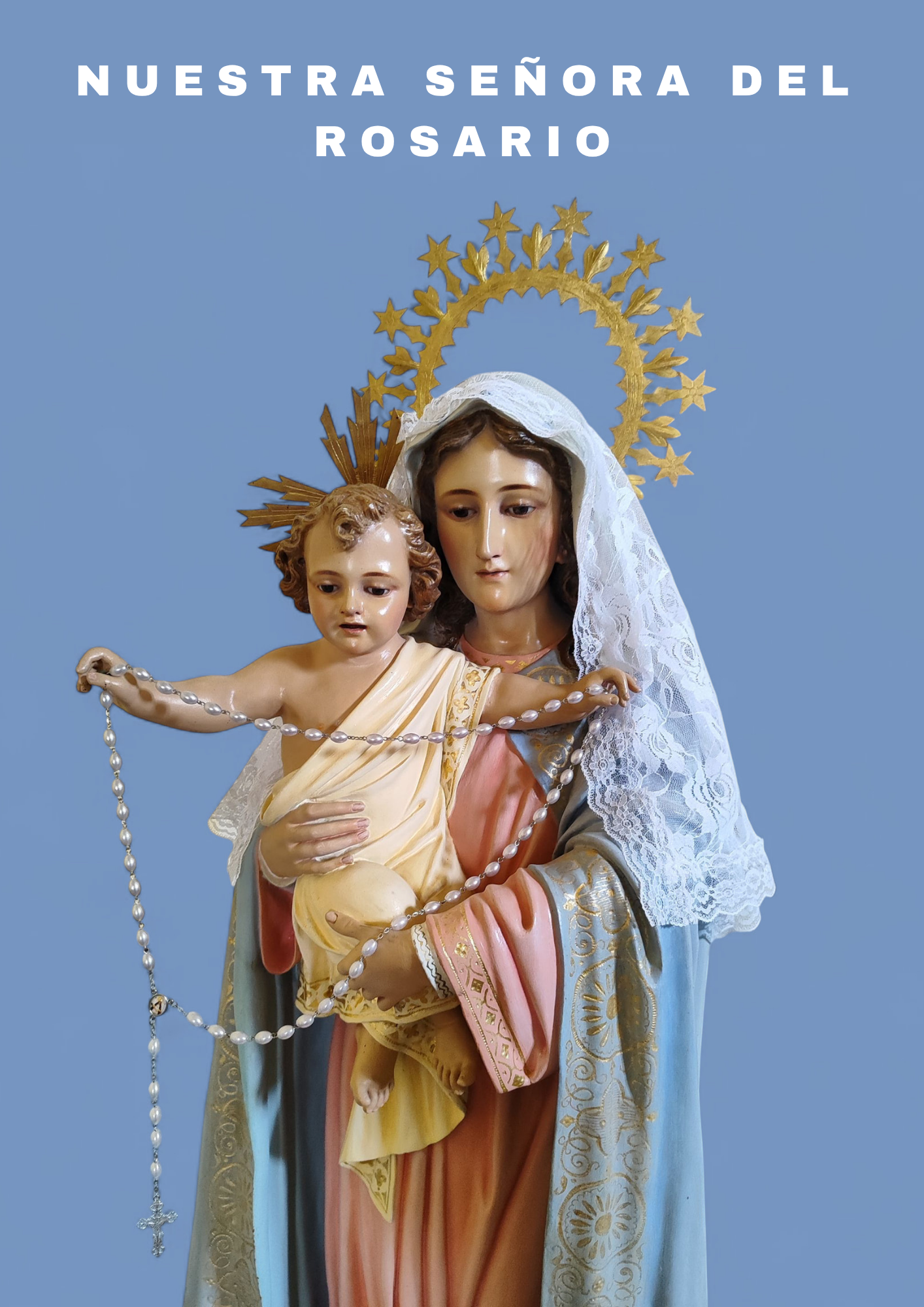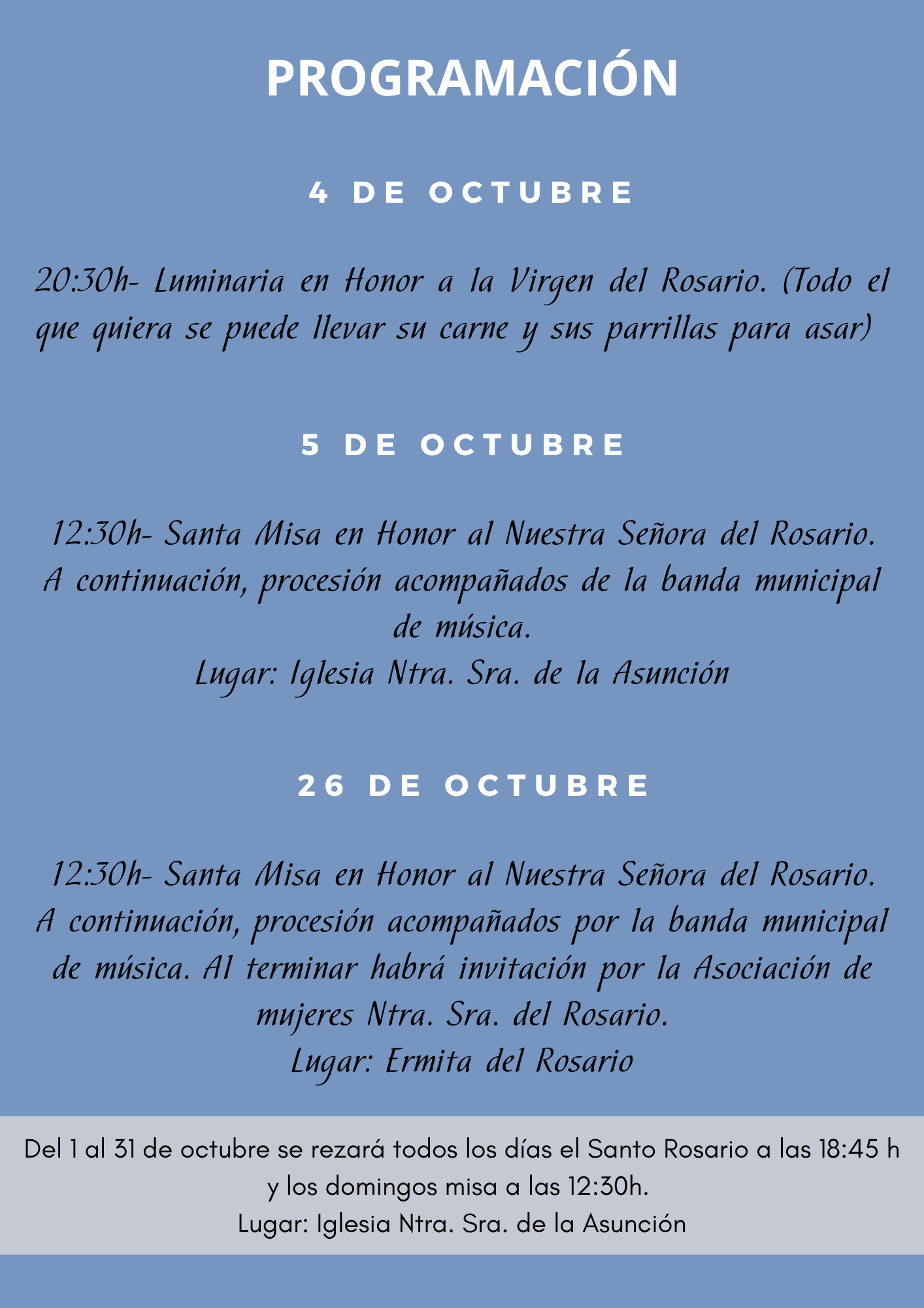 Programación de la festividad de la Virgen del Rosario. Debido a que su ermita está en obras, la misa se hará en la iglesia este domingo. La procesión subirá por la Calle Nueva y bajará por la Calle Rosario.