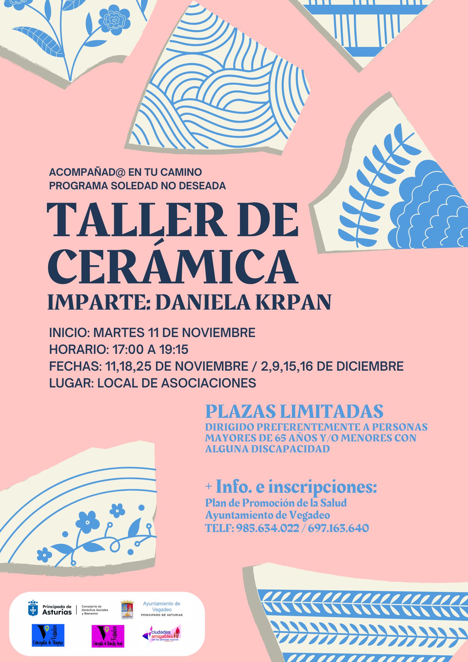 En el marco del Programa de Prevención de la Soledad no Deseada "ACOMPAÑAD@ EN TU CAMINO" del Ayuntamiento de Vegadeo, se pone en marcha un TALLER DE CERÁMICA dirigido a preferentemente a mayores de 65 años y/o menores con alguna discapacidad.