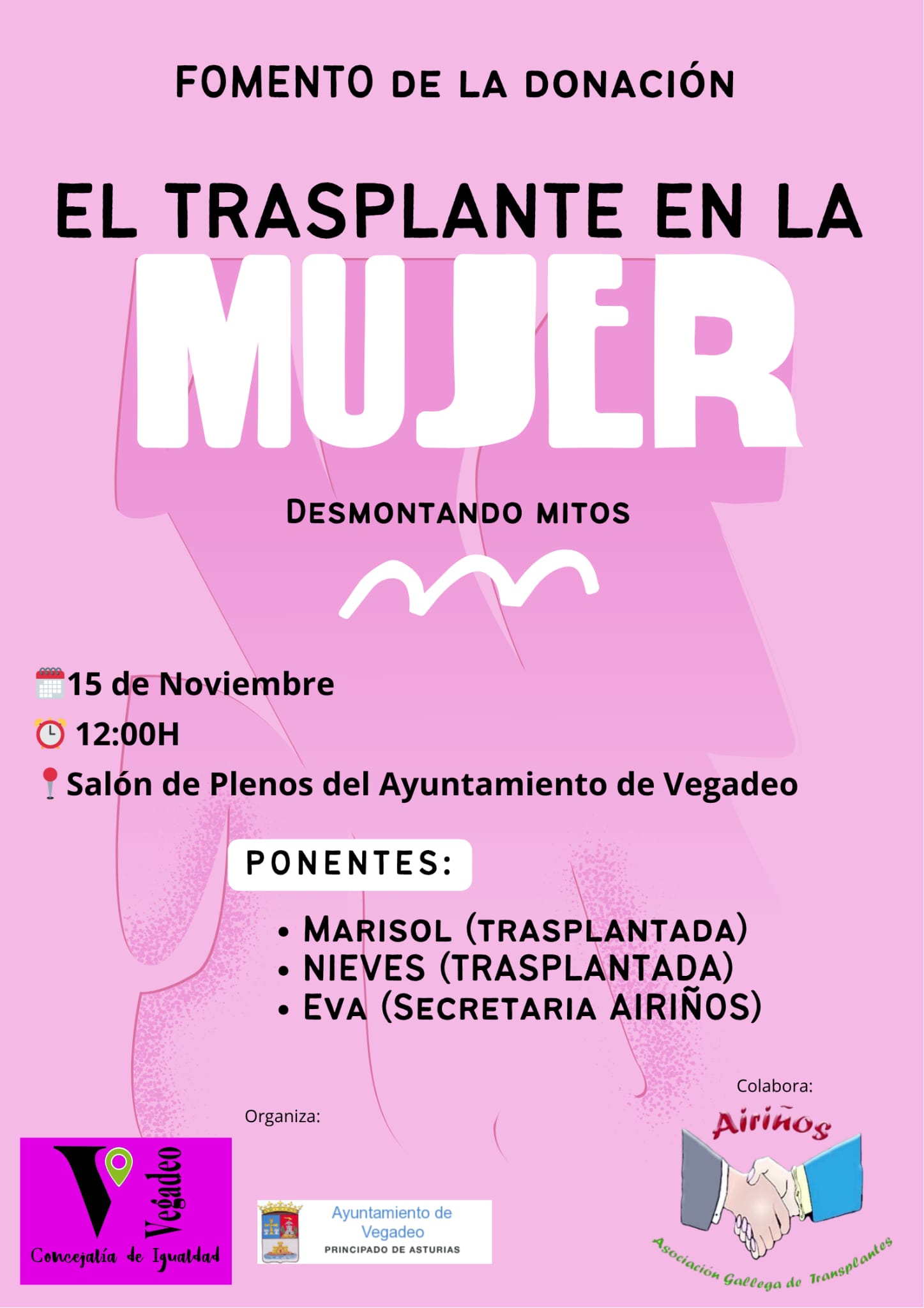 La Concejalía de Igualdad del Ayuntamiento de Vegadeo organiza, en colaboración con la Asociación AIRIÑOS - Asociación gallega de trasplantados, una charla que lleva por título "EL TRASPLANTE EN LA MUJER -DESMONTANDO MITOS", con el objetivo de fomentar la donación, promoviendo la participación de la comunidad y concienciando sobre la necesidad de donar.