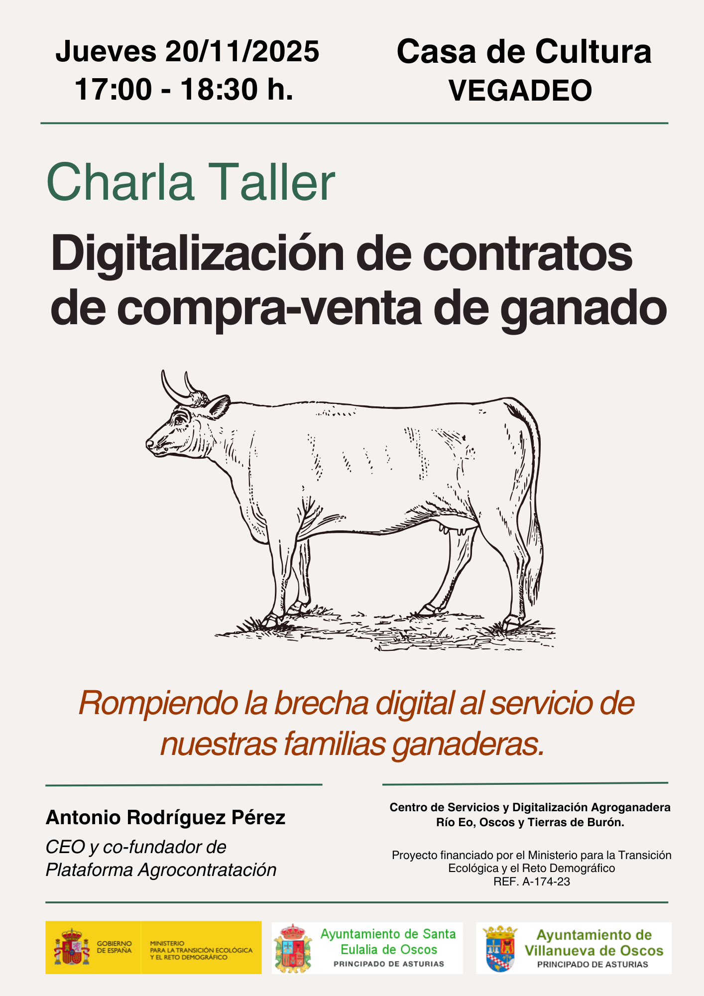El jueves 20 de noviembre, de 17:00 a 18:30 h., en la Casa de cultura de Vegadeo, tendrá lugar un espacio divulgativo orientado a los productores de ganado vacuno de nuestro concejo.