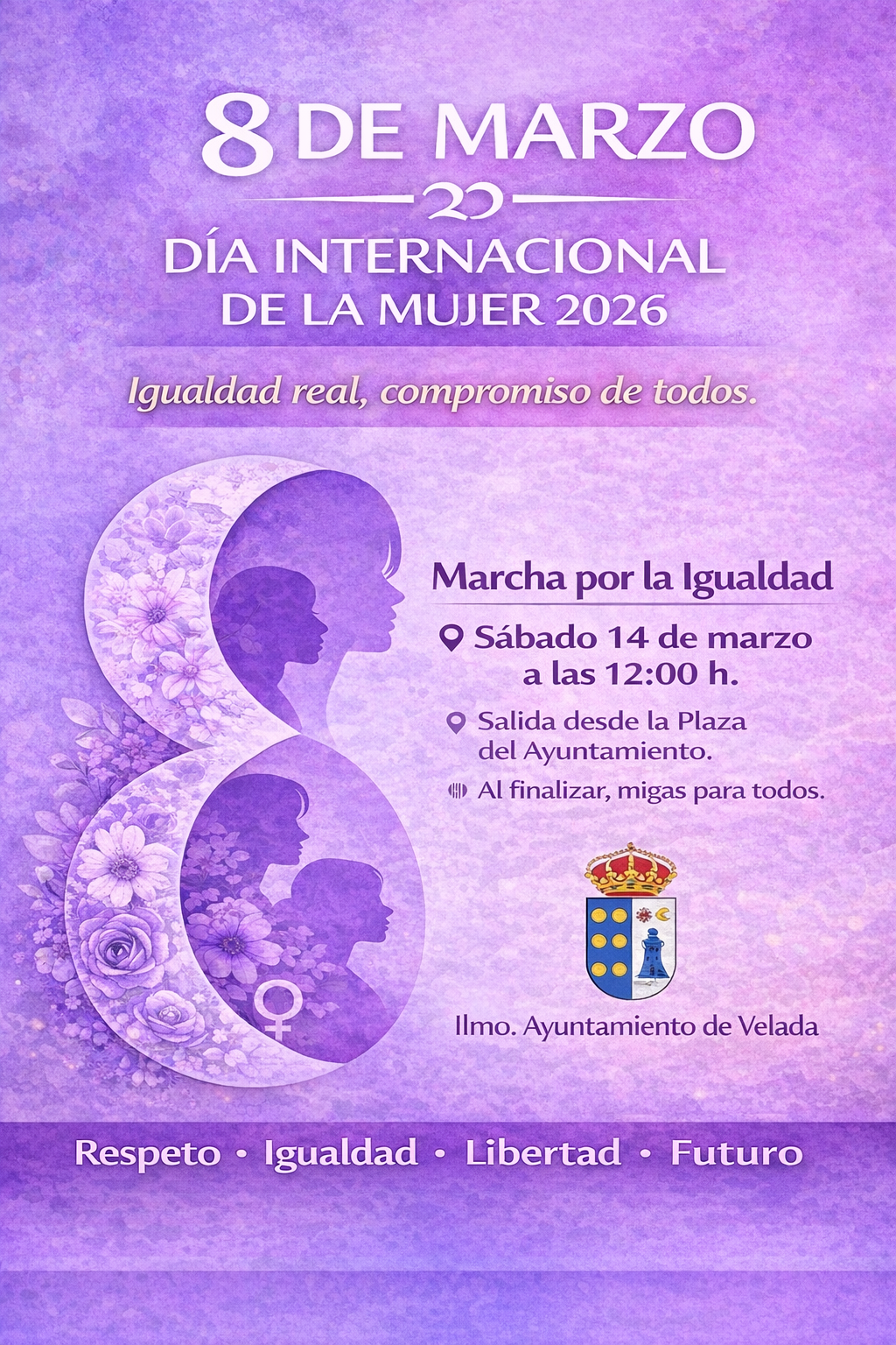 Con motivo del Día Internacional de la Mujer 2026, se celebra la "Marcha por la igualdad entre hombres y mujeres". Se invita a toda la ciudadanía a participar.- Fecha: sábado, 14 de marzo de 2026