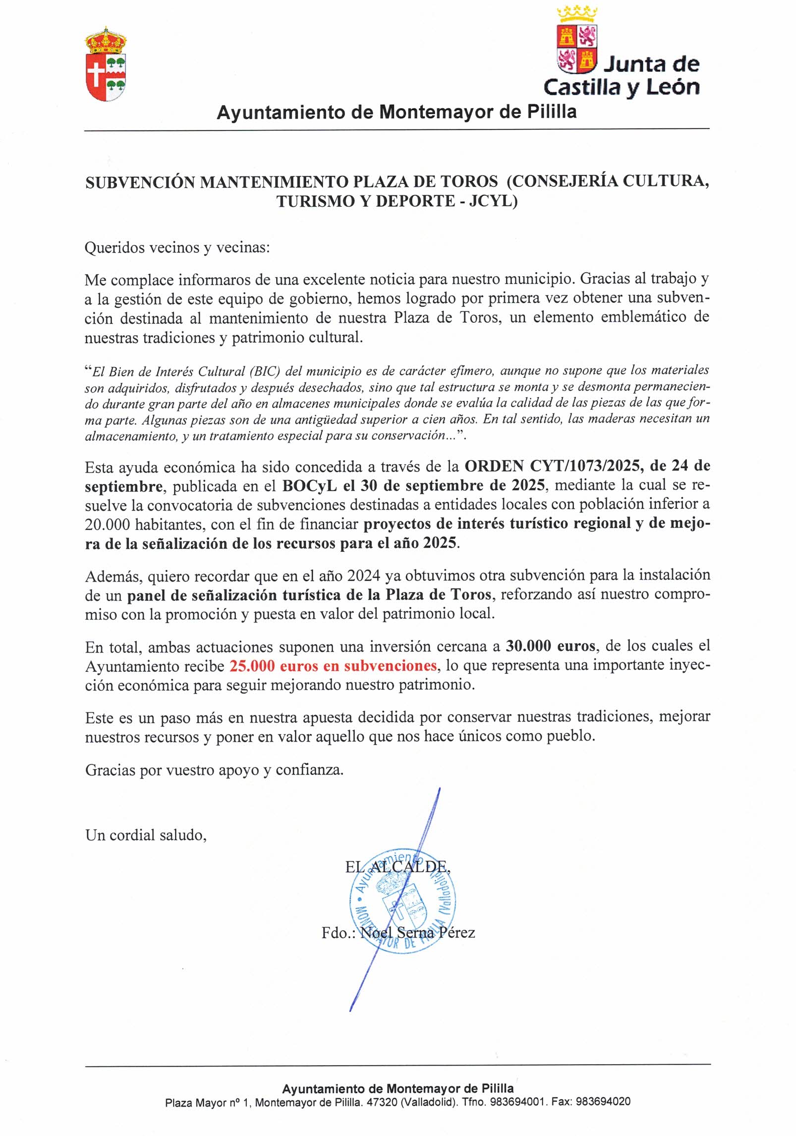 Información sobre la Concesión de Subvención para nuestra Plaza de Toros.2025-09-30 13:35:47Info General