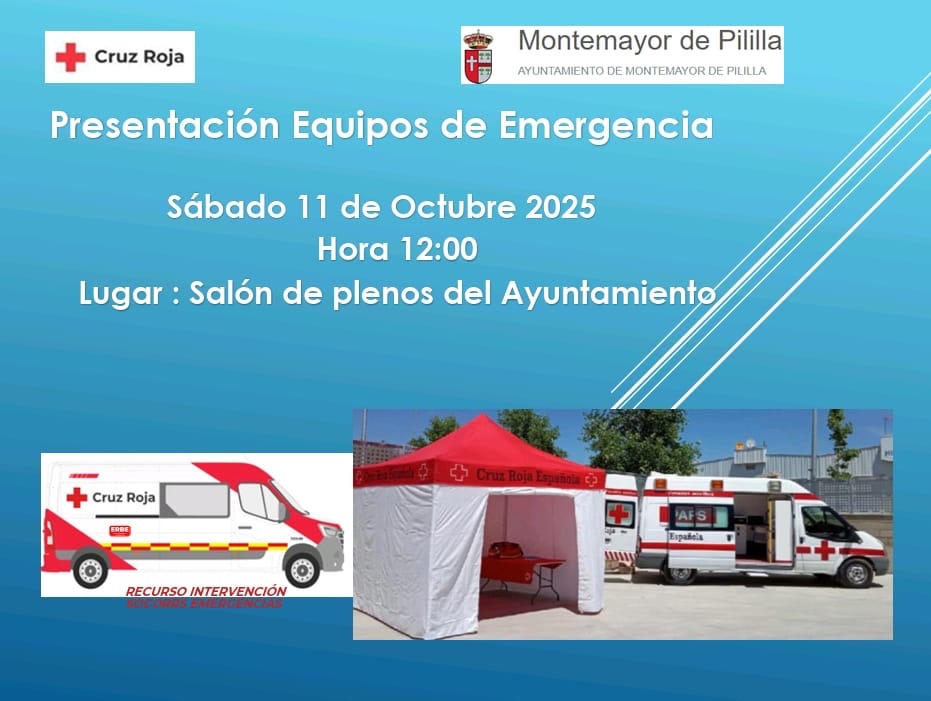 Desde la colaboración de este Ayuntamiento con Cruz Roja, presentamos este Sábado 11 de Octubre en el Salón de plenos y a las 12 horas, el acto de Presentación de Equipos se Emergencia de esta entidad.