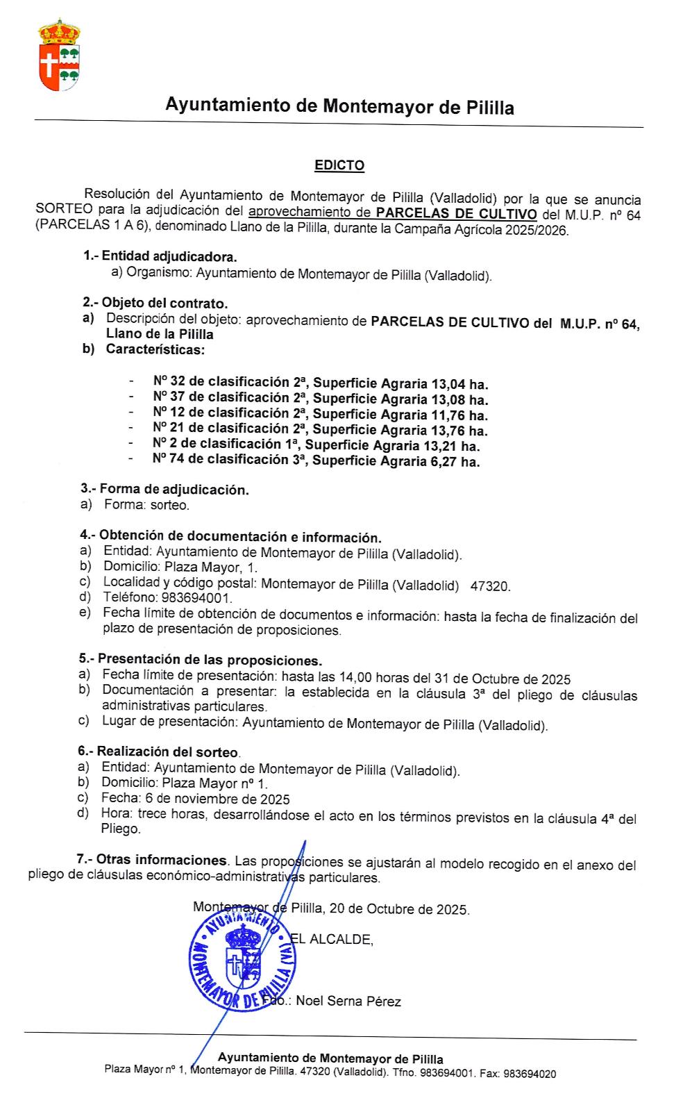 Por el presente, informamos de las condiciones del Sorteo para la adjudicación del aprovechamiento de PARCELAS DE CULTIVOS. Imagen adjunta a este Bando.