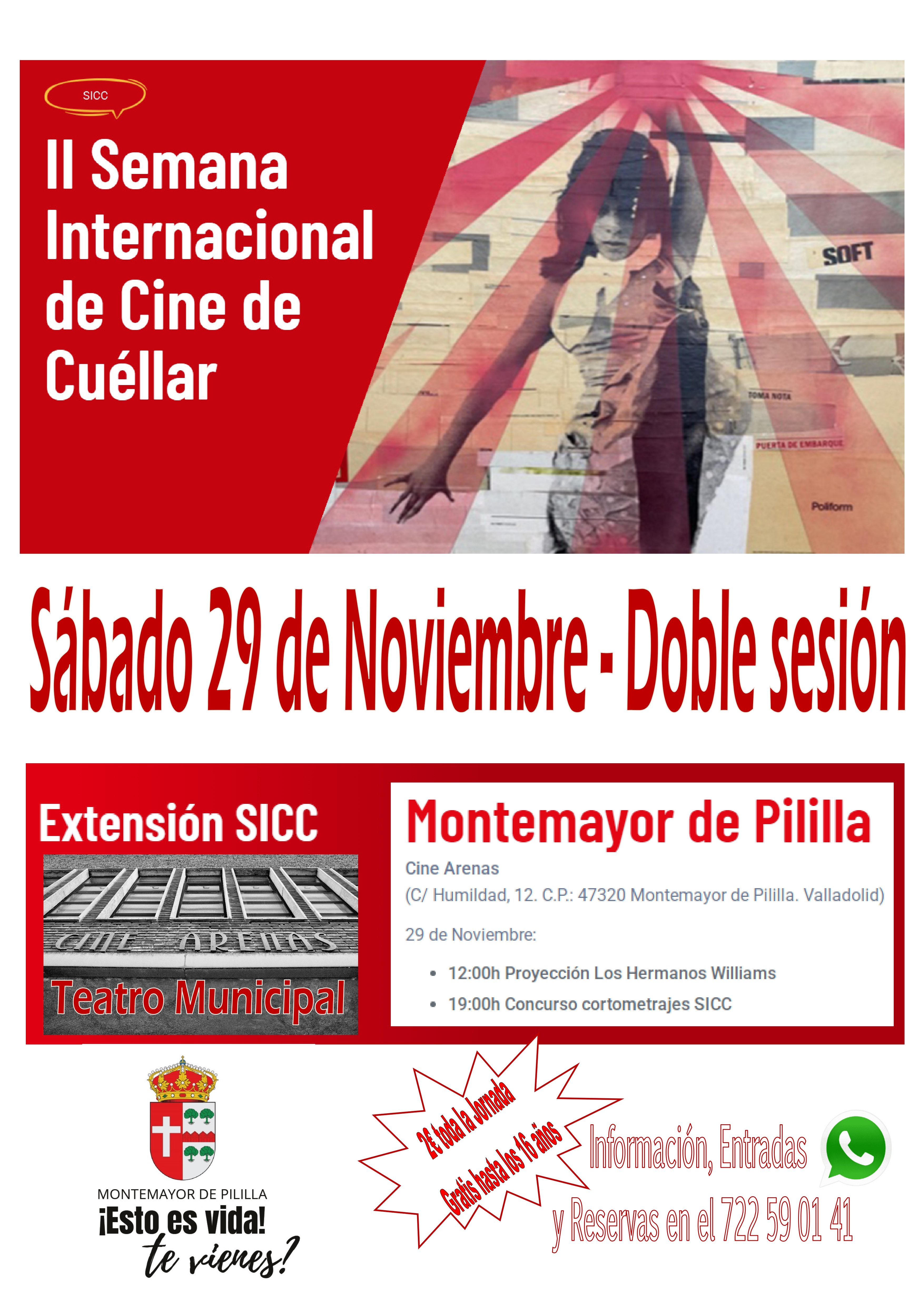 Sábado Cine Arenas - Extensión de la II Semana Internacional de Cine de Cuéllar (SICC)2025-11-27 12:14:38CulturaLa pasada semana se celebró la II Semana Internacional de Cine de Cuéllar (SICC), un evento que volvió a convertir a la Villa de Cuéllar en un punto de encuentro para los amantes del séptimo arte. Como colaboración y Extensión de dicha semana Montemayor de Pililla y nuestro fantástico Cine Arenas contará este fin de Semana (Sábado 29 de noviembre) con una sesión doble abierto a todos los públicos.