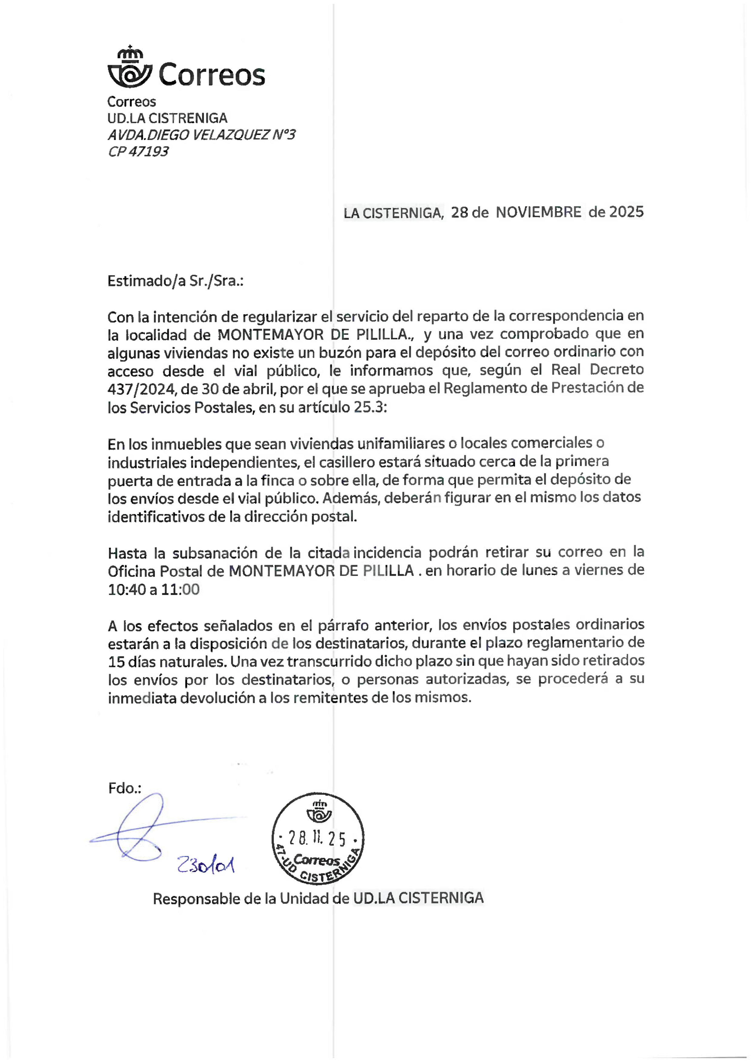 Nos informan desde la Oficina de correos de la obligatoriedadde contar con Buzónpara correo ordinario en los Domicilios (según Real Decreto 437/2024 art.25.3)