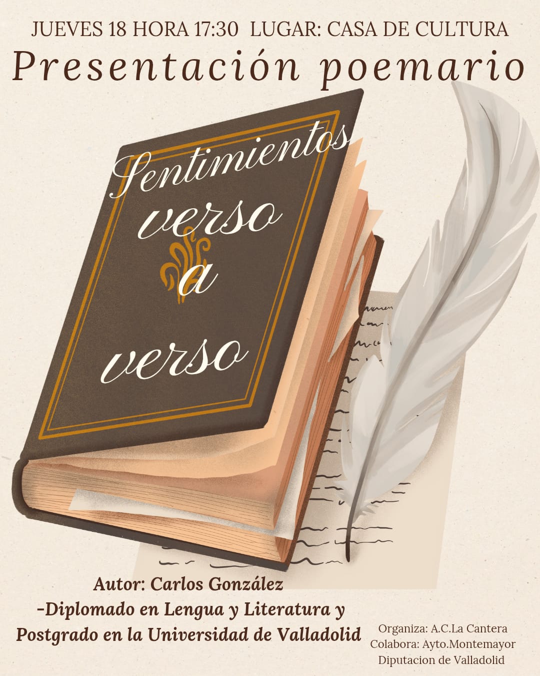 HOY Jueves 18 a las 17:30 - Casa de Cultura - Presentación del Poemario Semana cultural de Invierno de la Asociación Cultural "La Cantera"2025-12-18 15:08:58AsociacionesEn otra de las Actividades de la Semana cultural de Invierno de la Asociación Cultural "La Cantera", esta tarde a las 17:30 horas en la Casa de Cultura, Carlos González nos presentará su Poemario "Sentimientos Verso a Verso".
