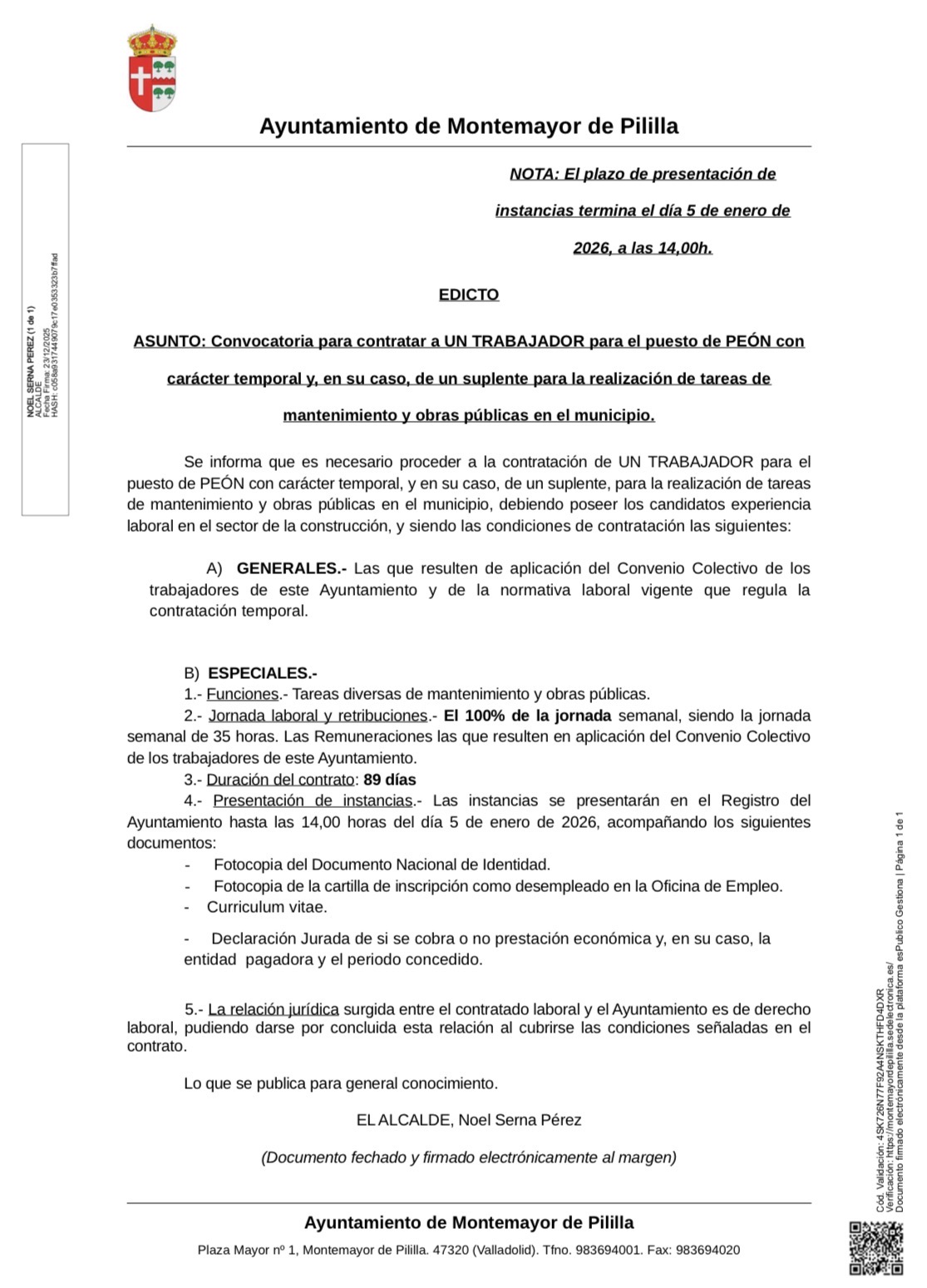 Convocatoria para contratar a UN TRABAJADOR para el puesto de PEÓN con carácter temporal y, en su caso, de un suplente para la realización de tareas de mantenimiento y obras públicas en el municipio.2025-12-29 11:31:57Empleo