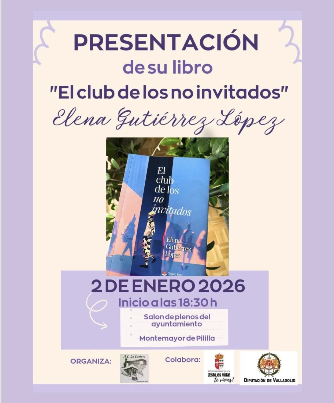 VIERNES 2 a las 18:30 horas en el SALÓN DE PLENOS del AYUNTAMIENTO con la Presentación del Libro “El club de los no invitados” de Elena Gutiérrez López2026-01-01 22:09:49CulturaComenzamos el NUEVO AÑO con la