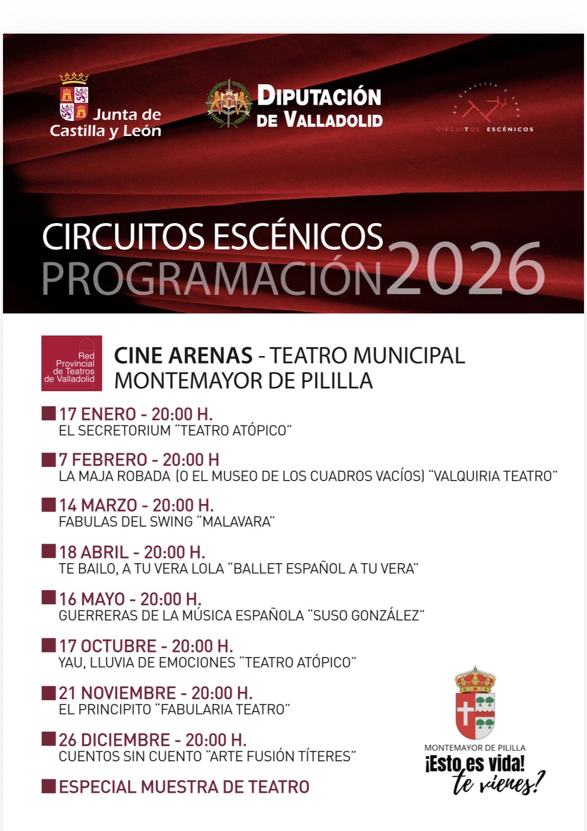Programación Circuitos escénicos 2026 - Sábado 17 estreno en Cine Arenas2026-01-10 13:48:48CulturaAdjuntamos en el presente Bando la Programación 2026 de Circuitos escénicos 2026 a través de Red Provincial de Teatros de Valladolid. Además, recordamos que con el Abono anual (a precios muy populares de 30, 25 ó 15€:nuevo Abono infantil/juvenil) se cuenta con un espectáculo “a mayores” incluido.