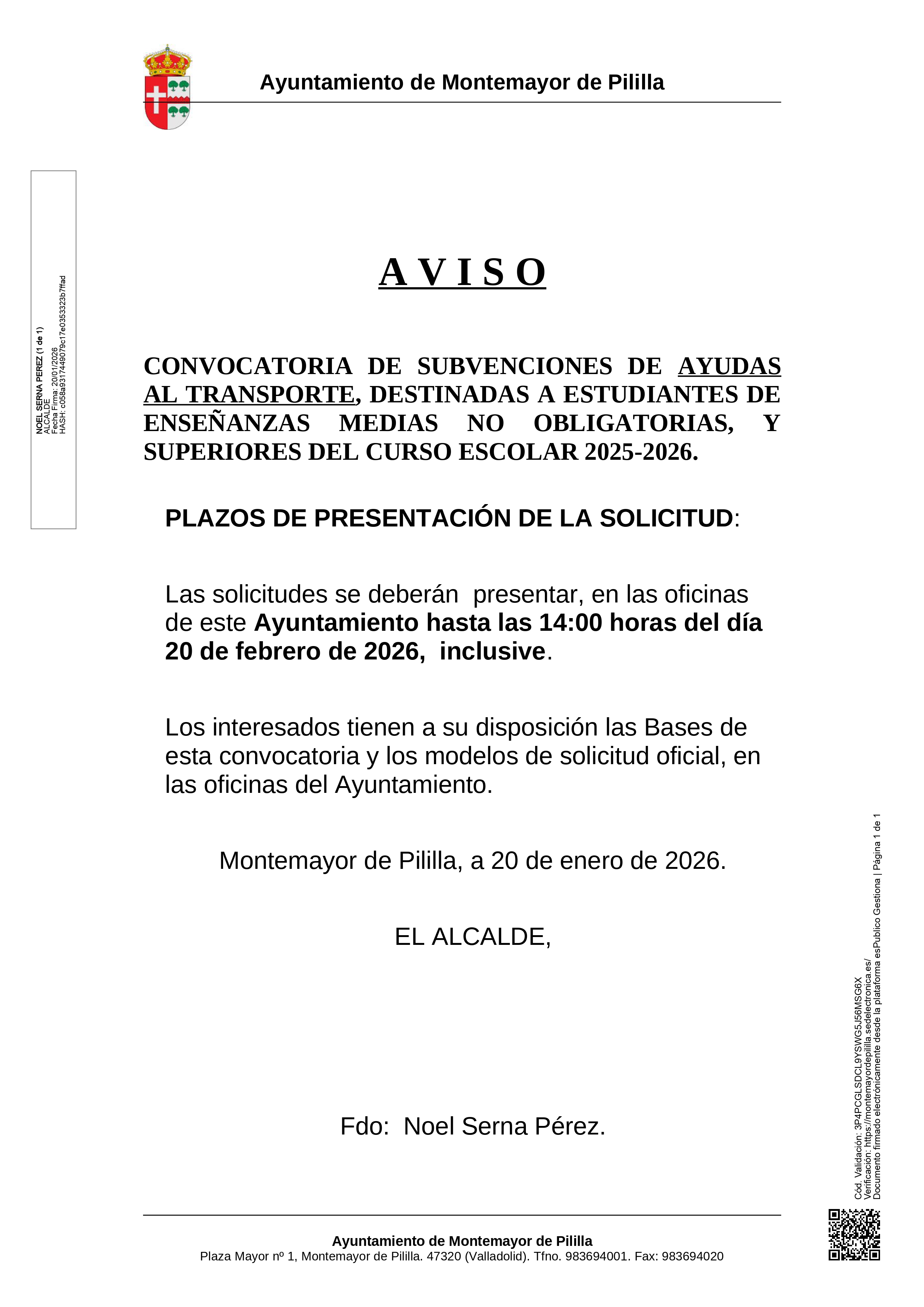 CONVOCATORIA DE SUBVENCIONES DE AYUDAS AL TRANSPORTE, DESTINADAS A ESTUDIANTES DE ENSEÑANZAS MEDIAS NO OBLIGATORIAS, Y SUPERIORES DEL CURSO ESCOLAR 2025-2026.