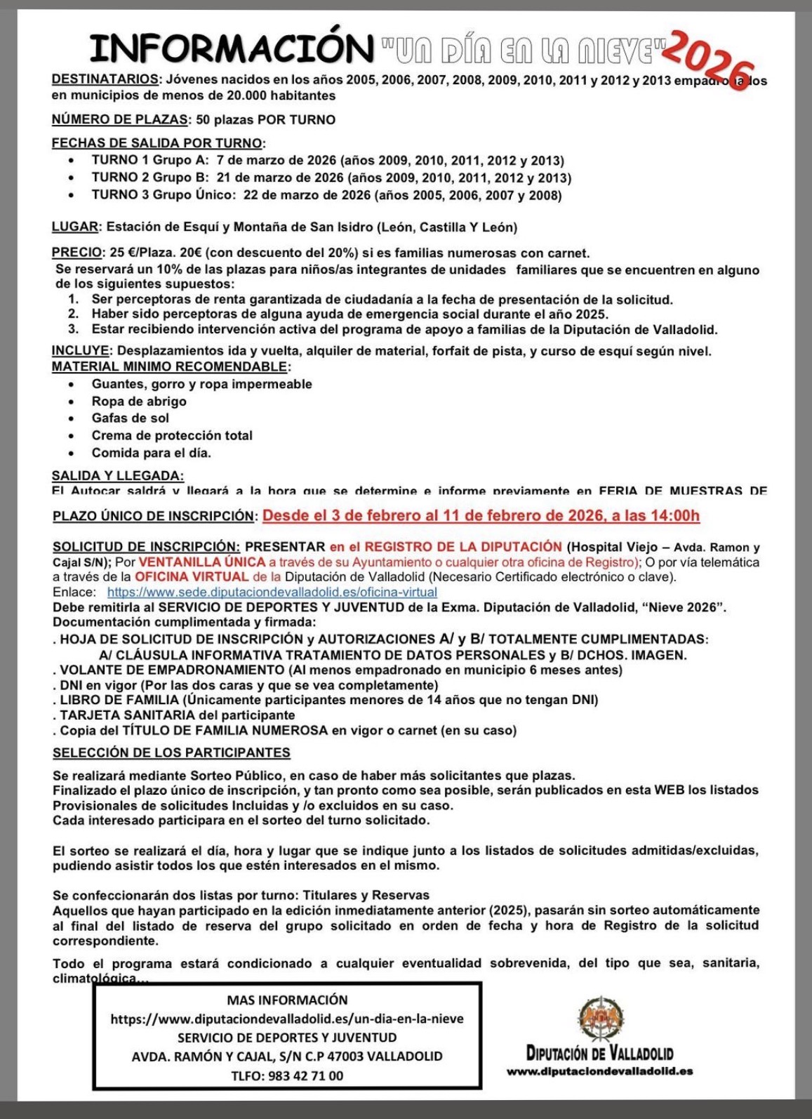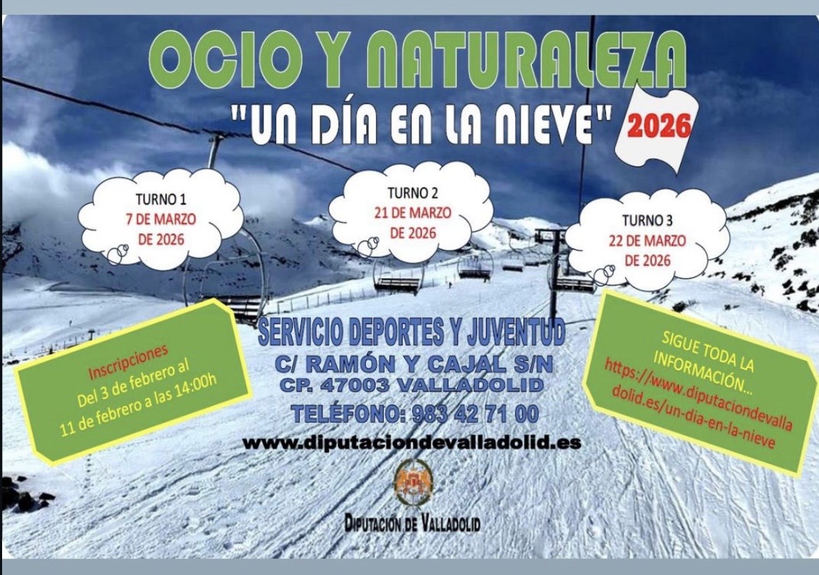 Adjuntamos la información relativa a la actividad “Un día en la Nieve 2026” que organiza la Diputación de Valladolid dentro del programa, Ocio, Tiempo Libre y Naturaleza para el año 2026.
