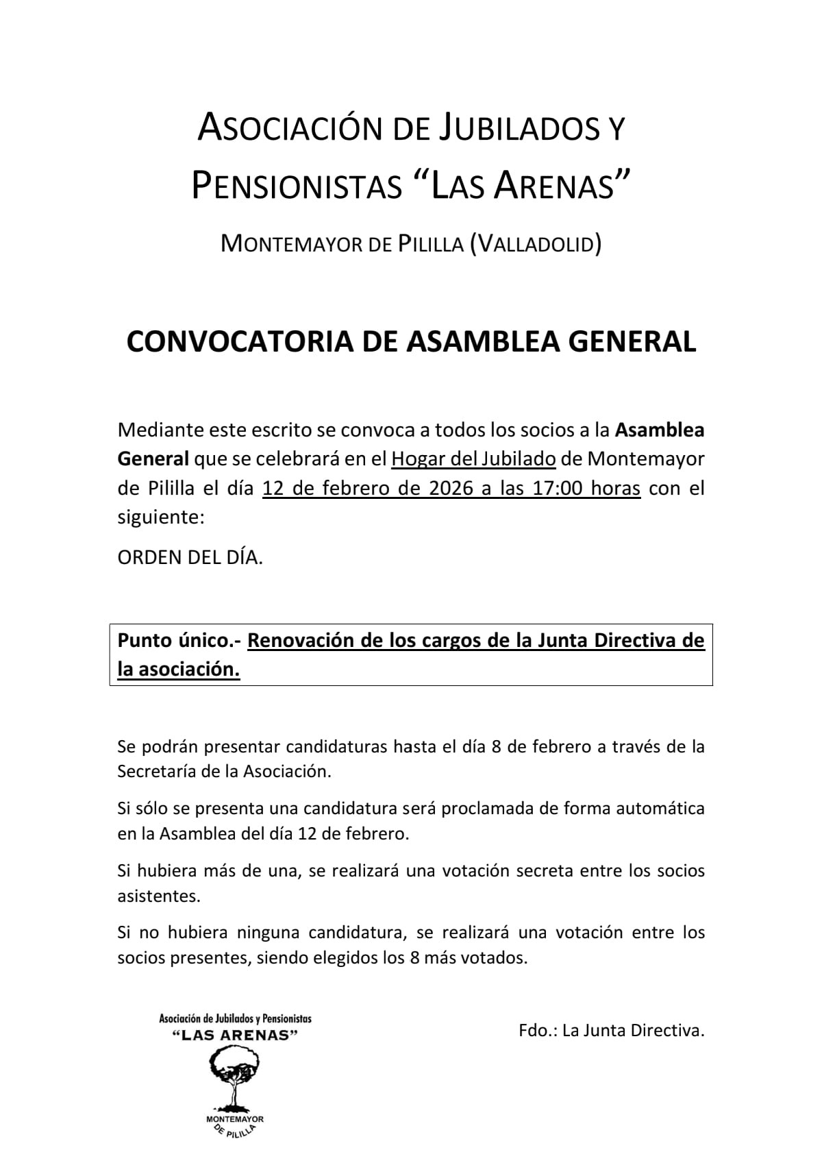Adjuntamos el cartel oficial que anuncia la Asamblea general de la Asociación “Las Arenas”, que será el próximo 12 de febrero a las 17 horas