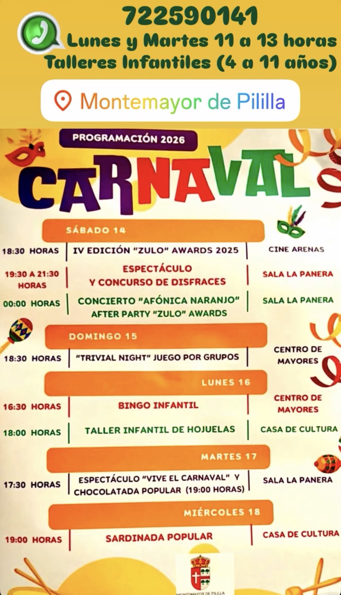 Programación oficial del nuevo Carnaval 20262026-02-13 11:11:00CulturaPresentamos la Programación oficial del nuevo Carnaval 2026 en Montemayor de Pililla.