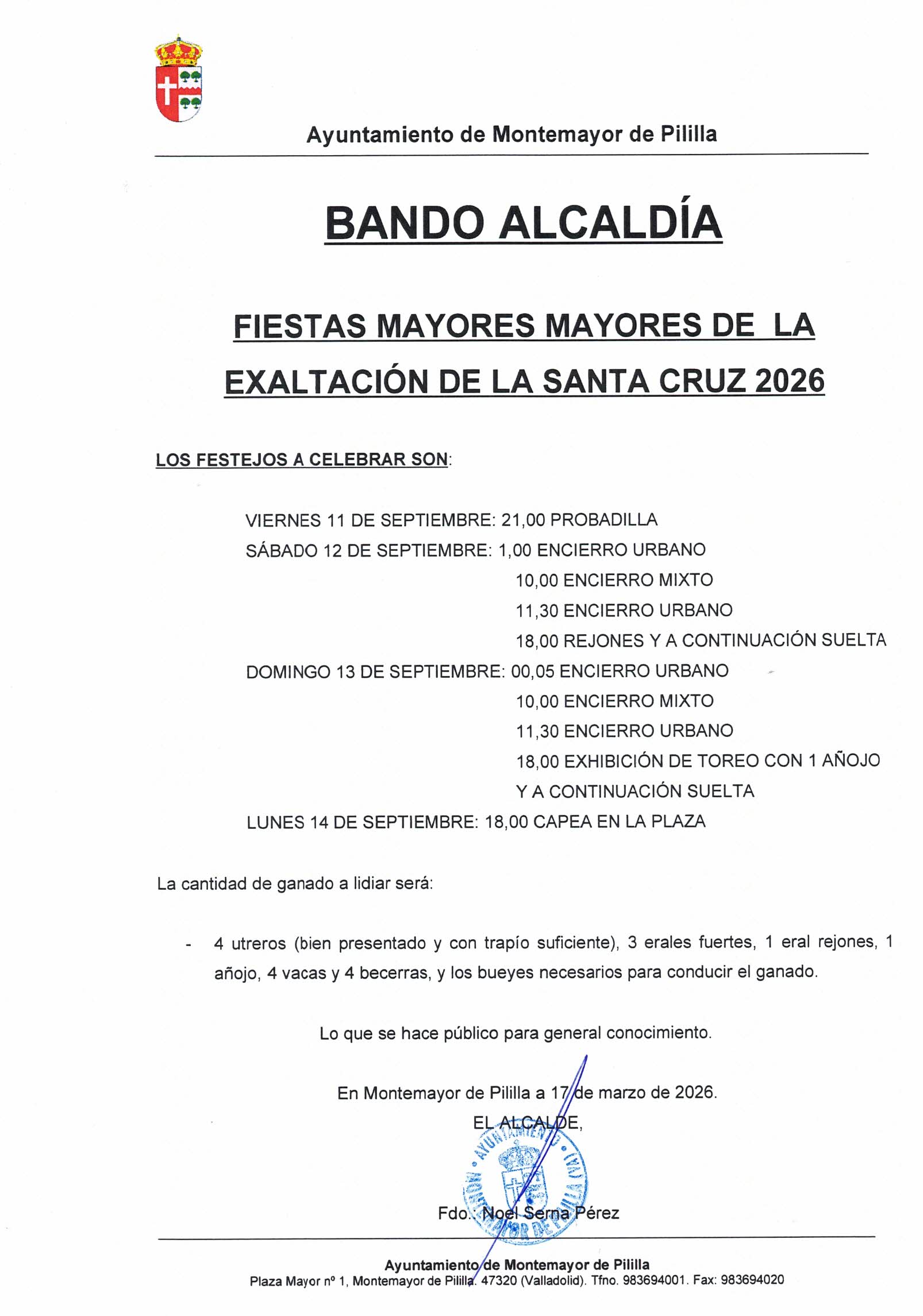 Con el presente Bando informamos sobre las fechas y eventos taurinos FIESTAS MAYORES de la Exaltación de la Santa Cruz 2026.