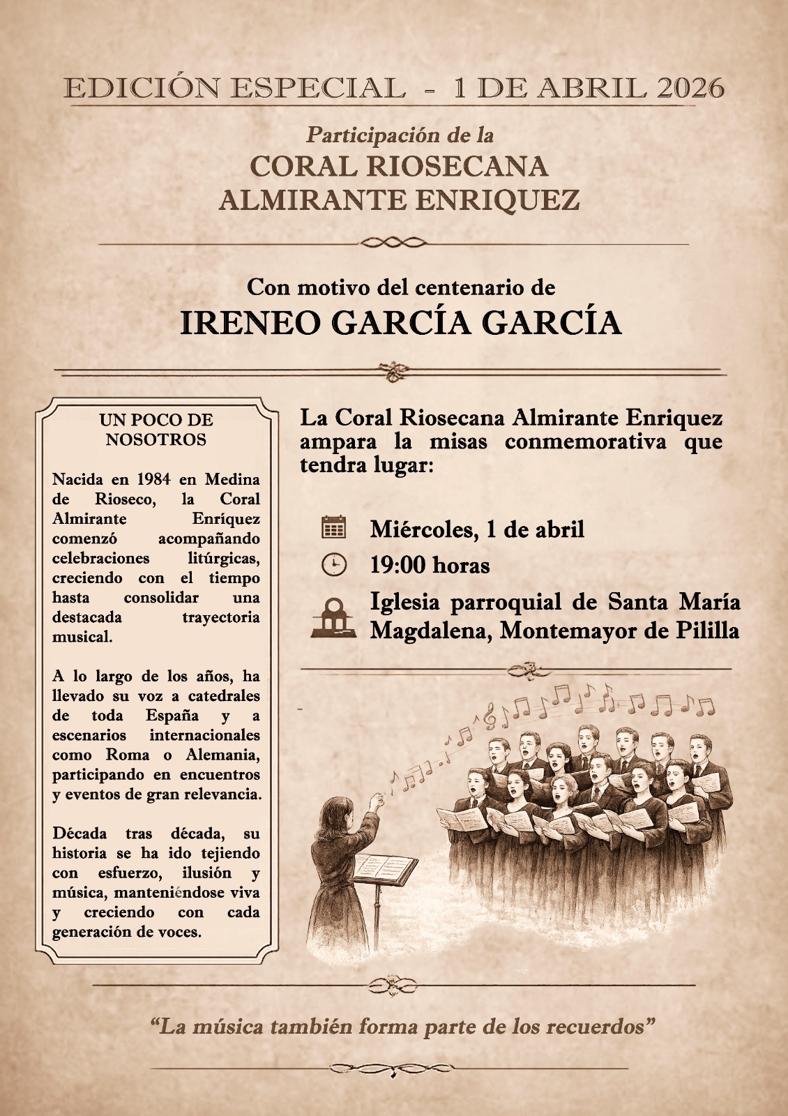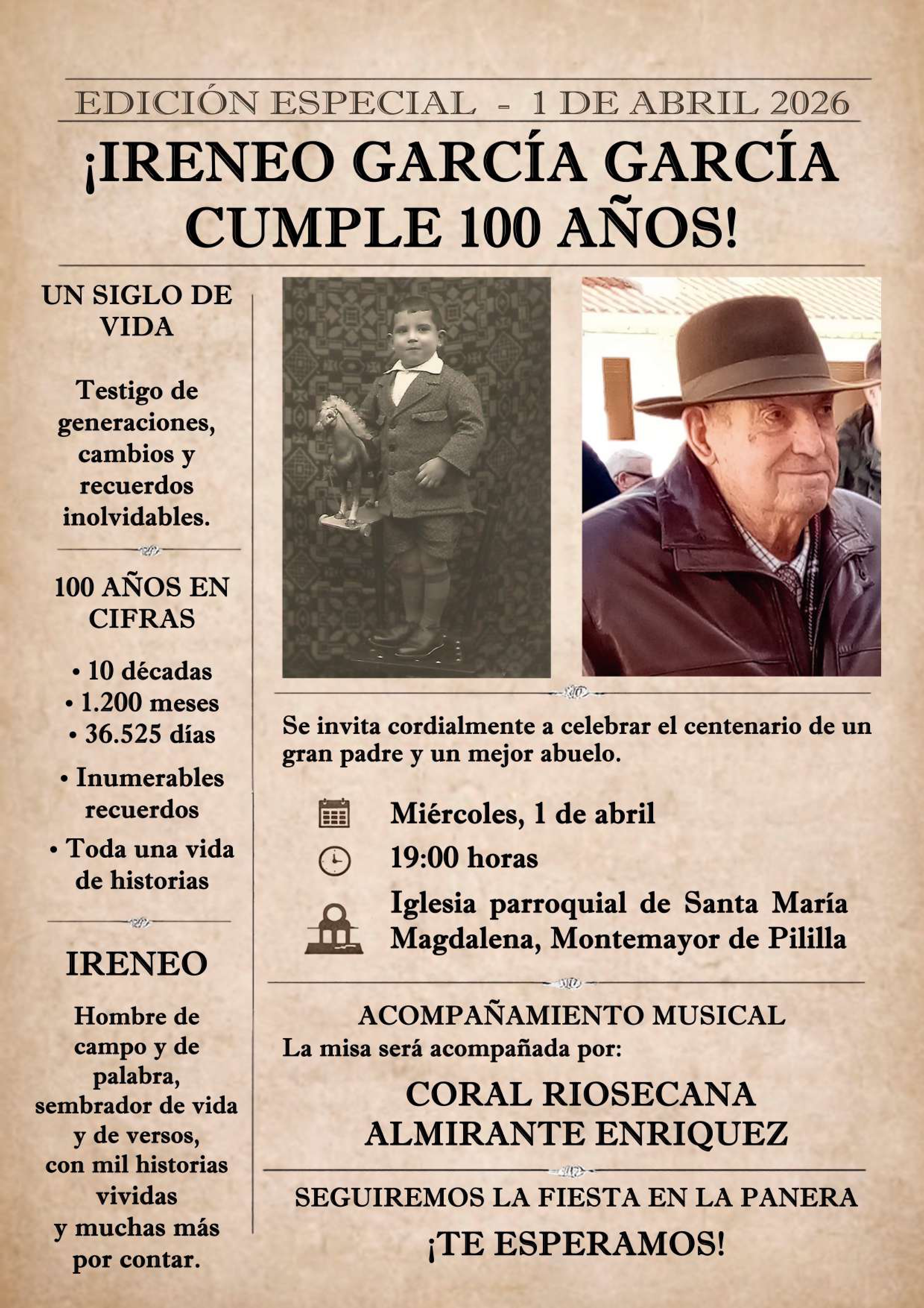 MIÉRCOLES 1 de Abril_19 horas Celebración del Centenario de nuestro vecino “Ireneo García García”2026-03-27 11:59:15Info General