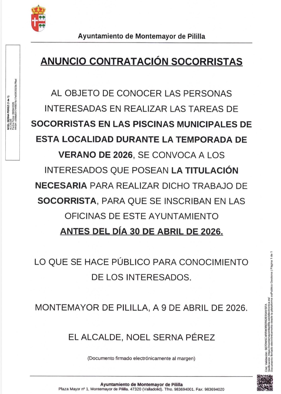 ANUNCIO CONTRATACIÓN SOCORRISTAS TEMPORADA DE VERANO DE 20262026-04-09 13:35:28Info GeneralAL OBJETO DE CONOCER LAS PERSONAS INTERESADAS EN REALIZAR LAS TAREAS DE SOCORRISTAS EN LAS PISCINAS MUNICIPALES DE ESTA LOCALIDAD DURANTE LA TEMPORADA DE VERANO DE 2026, SE CONVOCA A LOS INTERESADOS QUE POSEAN LA TITULACIÓN NECESARIA PARA REALIZAR DICHO TRABAJO DE SOCORRISTA, PARA QUE SE INSCRIBAN EN LAS OFICINAS DE ESTE AYUNTAMIENTO ANTES DEL DÍA 30 DE ABRIL DE 2026.