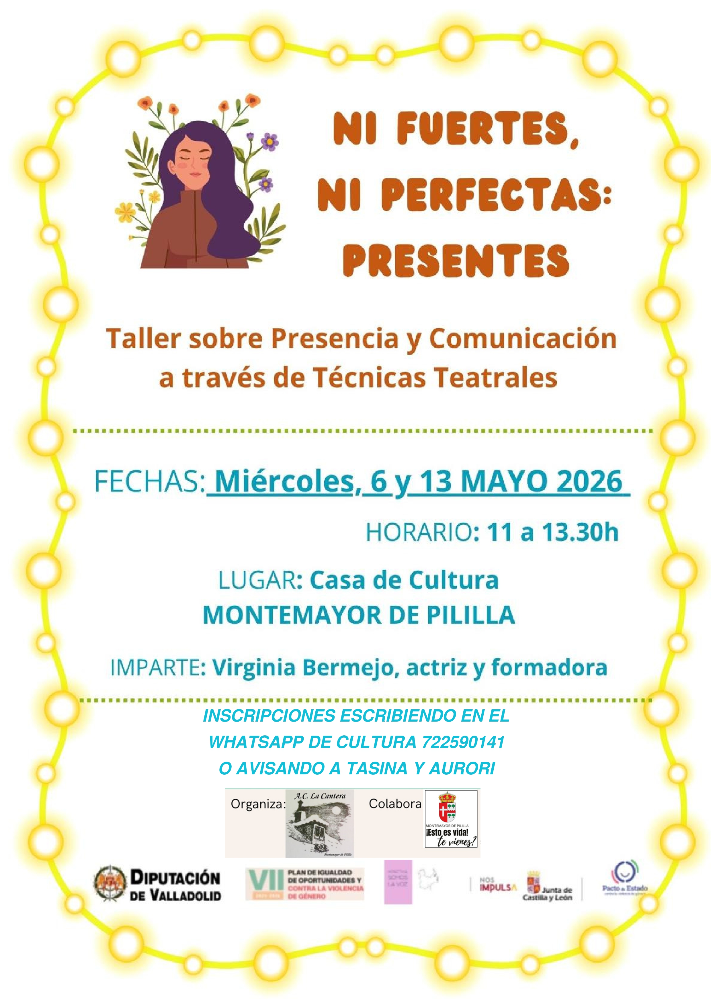 Taller para Mujeres en 2 sesiones de Mayo: miércoles 6 y 13.2026-04-29 15:08:37IgualdadLa Asociación "La Cantera" y la Concejalía de Cultura y la de Bienestar social presentan esta propuesta de Diputación de Valladolid, dos sesiones de maána para Mujeres, y con toda la información en el Cartel adjunto del Bando.