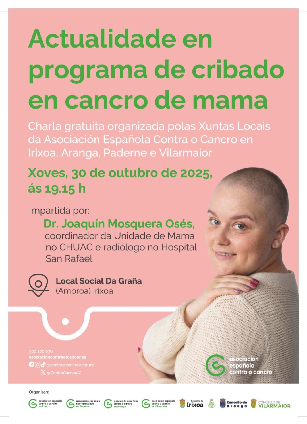 Para conmemorar o día mundial de loita contra o Cancro de Mama, as xuntas locais da Asociación Española contra o Cancro, de Irixoa, Paderne, Aranga e Vilarmaior, teñen programada unha charla gratuíta para o xoves, 30 de outubro de 2025, ás 19.15 horas, impartida polo Doutor Joaquín Mosquera Osés, coordinador da Unidade de Mama no CHUAC e radiólogo no Hospital San Rafael.