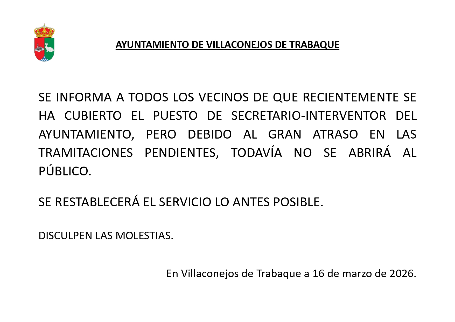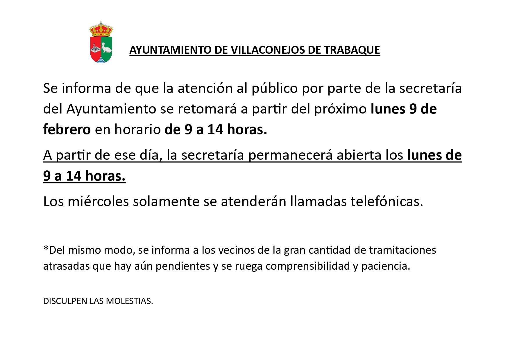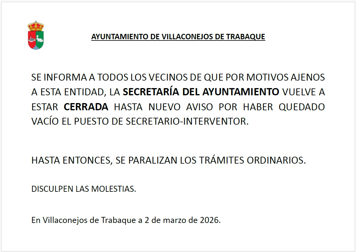 Se informa de que la atención al público por parte de la secretaría del Ayuntamiento se retomará a partir del próximo lunes 9 de febrero en horario de 9 a 14 horas.