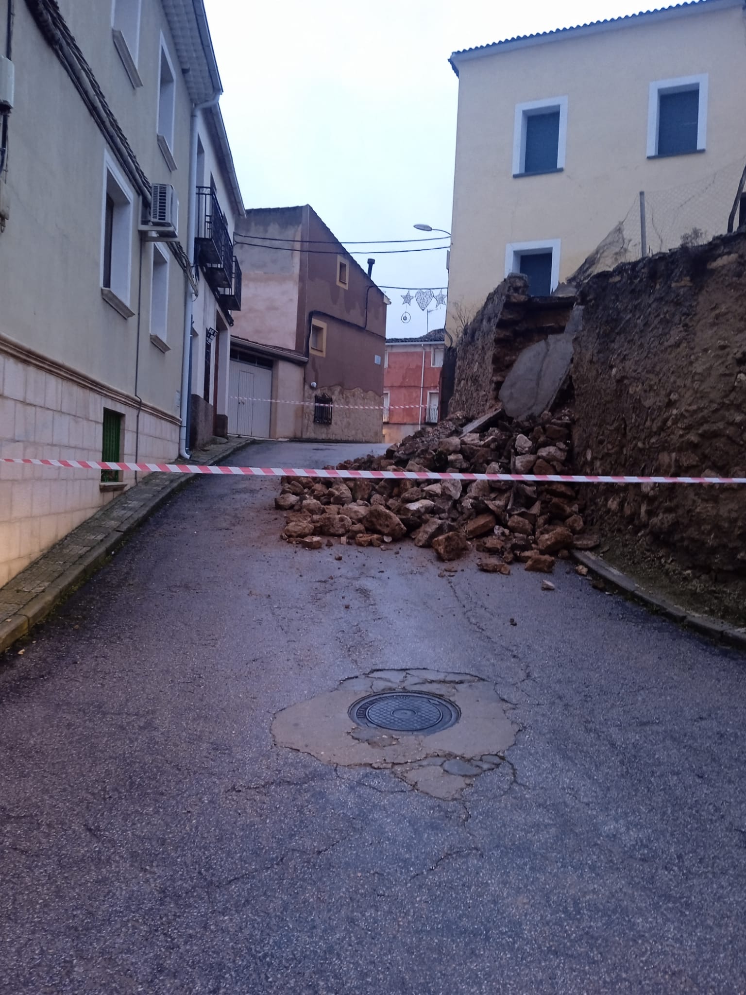 Se informa de que la calle Cañamares se encuentra cortada en su bajada desde la Plaza Mayor hacia la Carnicería Doro debido al desprendimiento de un muro.