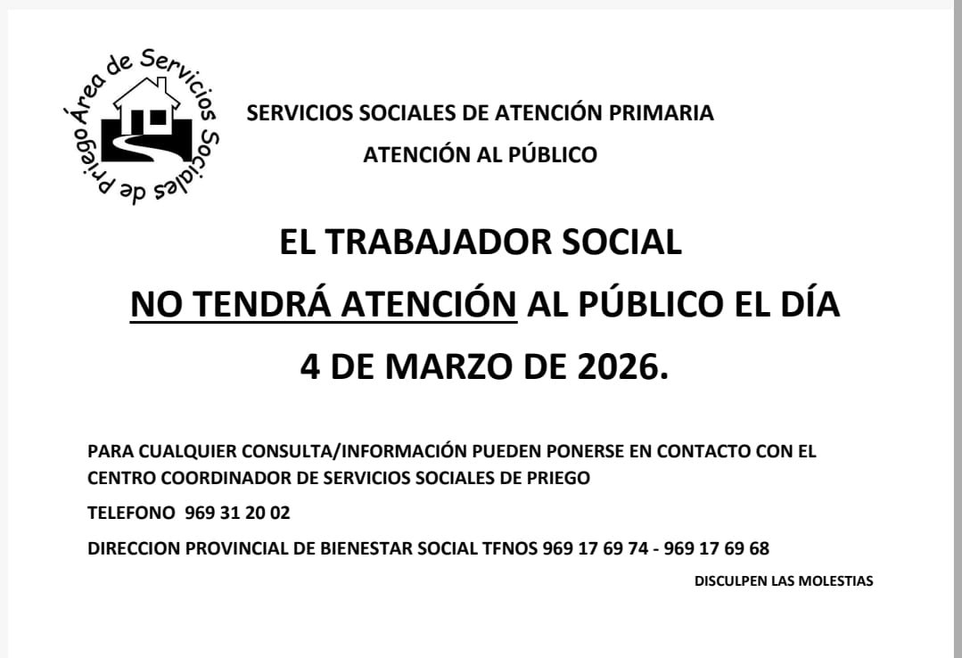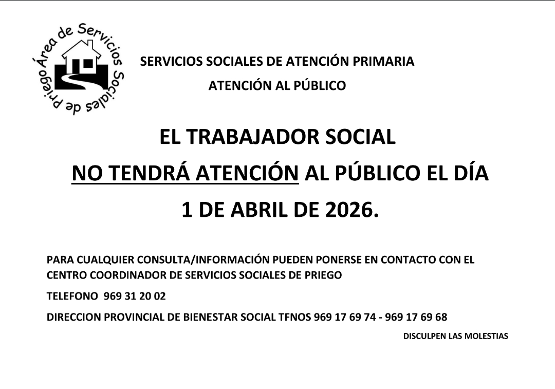 Esta semana habrá atención presencial del Trabajador Social el JUEVES día 12 de marzo.
