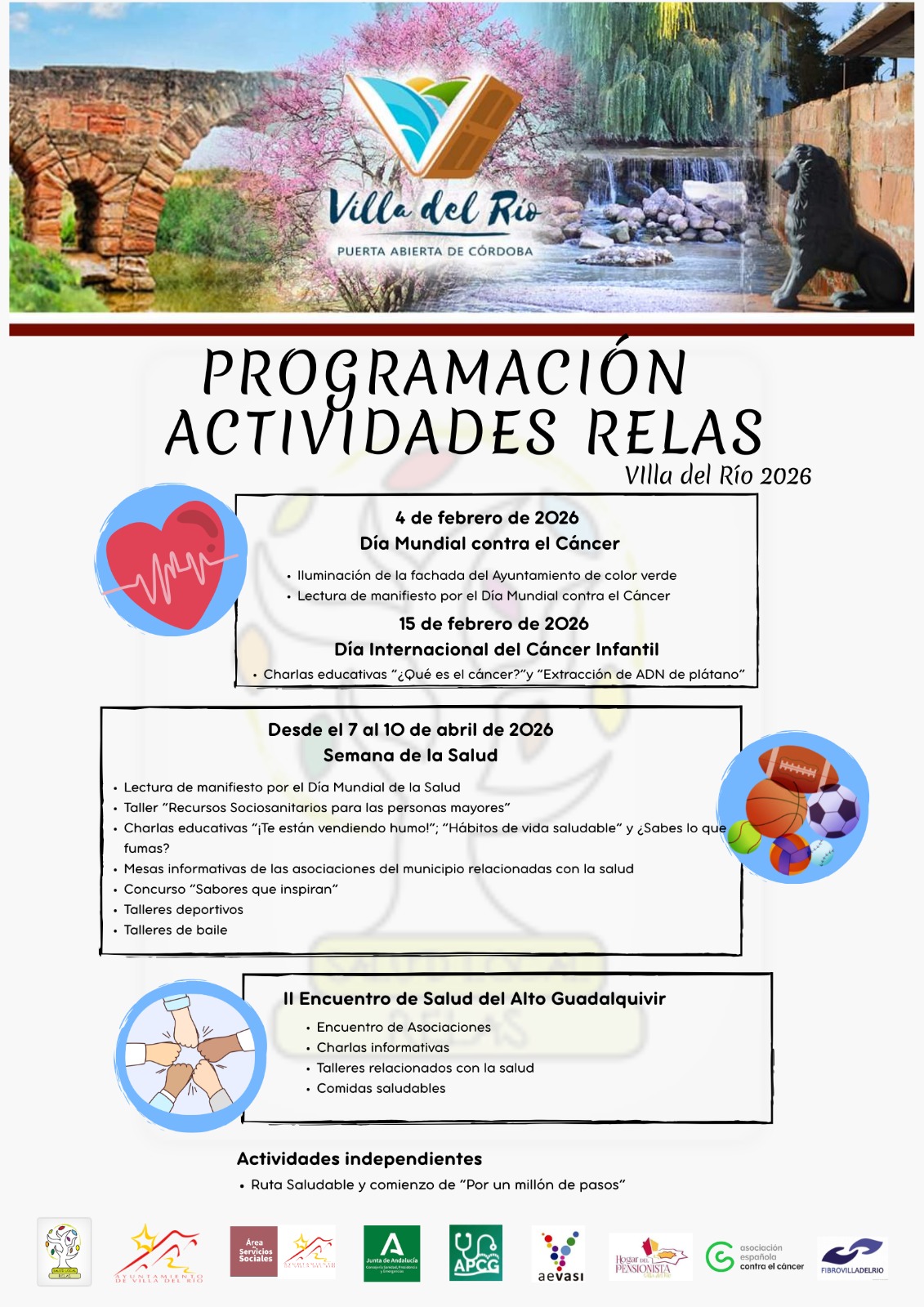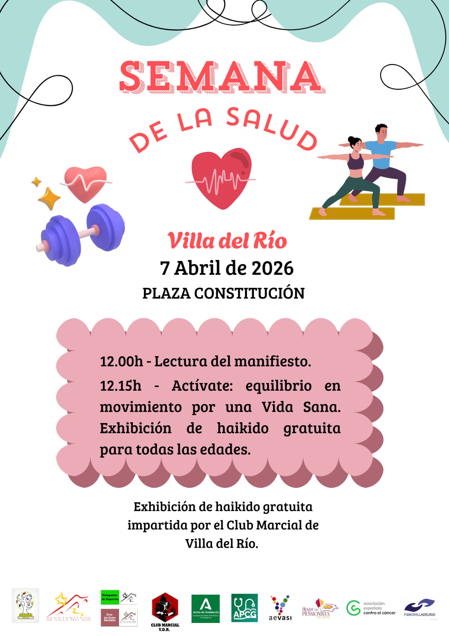 El área de Bienestar Social del Ayuntamiento de Villa del Río informa sobre la programación de actividades con motivo de la Semana de la Salud 2026, una iniciativa que se desarrolla en el marco de la Red Local de Acción en Salud (RELAS), con el objetivo de fomentar hábitos de vida saludables entre la ciudadanía en todas las etapas de la vida.