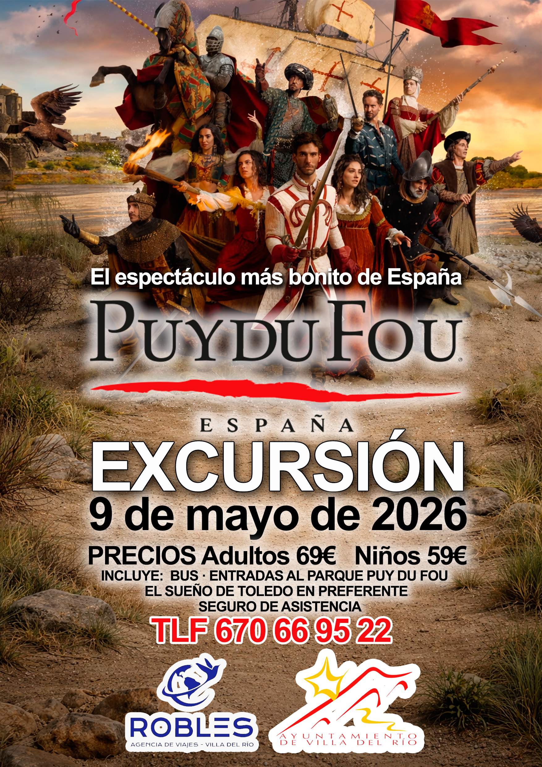 El Ayuntamiento de Villa del Río informa sobre la organización de una excursión al parque histórico Puy du Fou España, considerado uno de los espectáculos históricos más impresionantes del país.