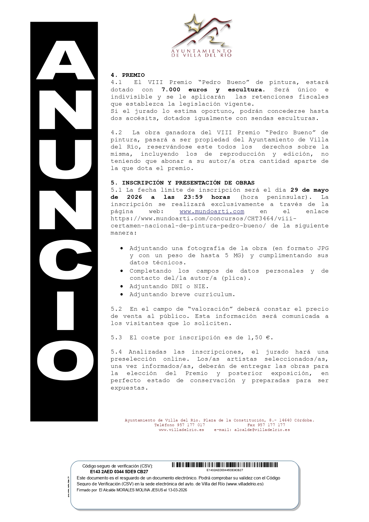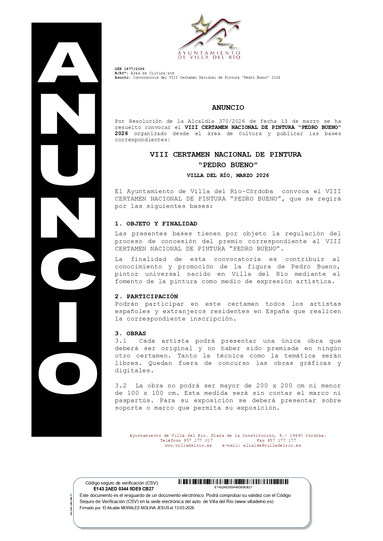 BASES DEL VIII CERTAMEN NACIONAL DE PINTURA "PEDRO BUENO" VILLA DEL RÍO 2026