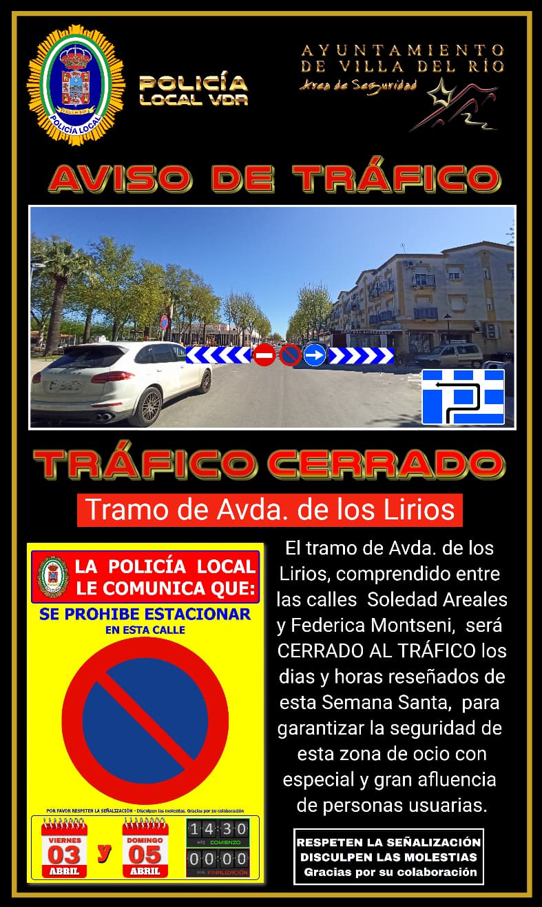 El área de Seguridad del Ayuntamiento de Villa del Río informa que el tramo de la Avda. de los Lirios, comprendido entre las calles Soledad Areales y Federica Montseny, permanecerá cerrado al tráfico, con el objetivo de garantizar la seguridad en esta zona de ocio ante la especial afluencia de personas usuarias.
