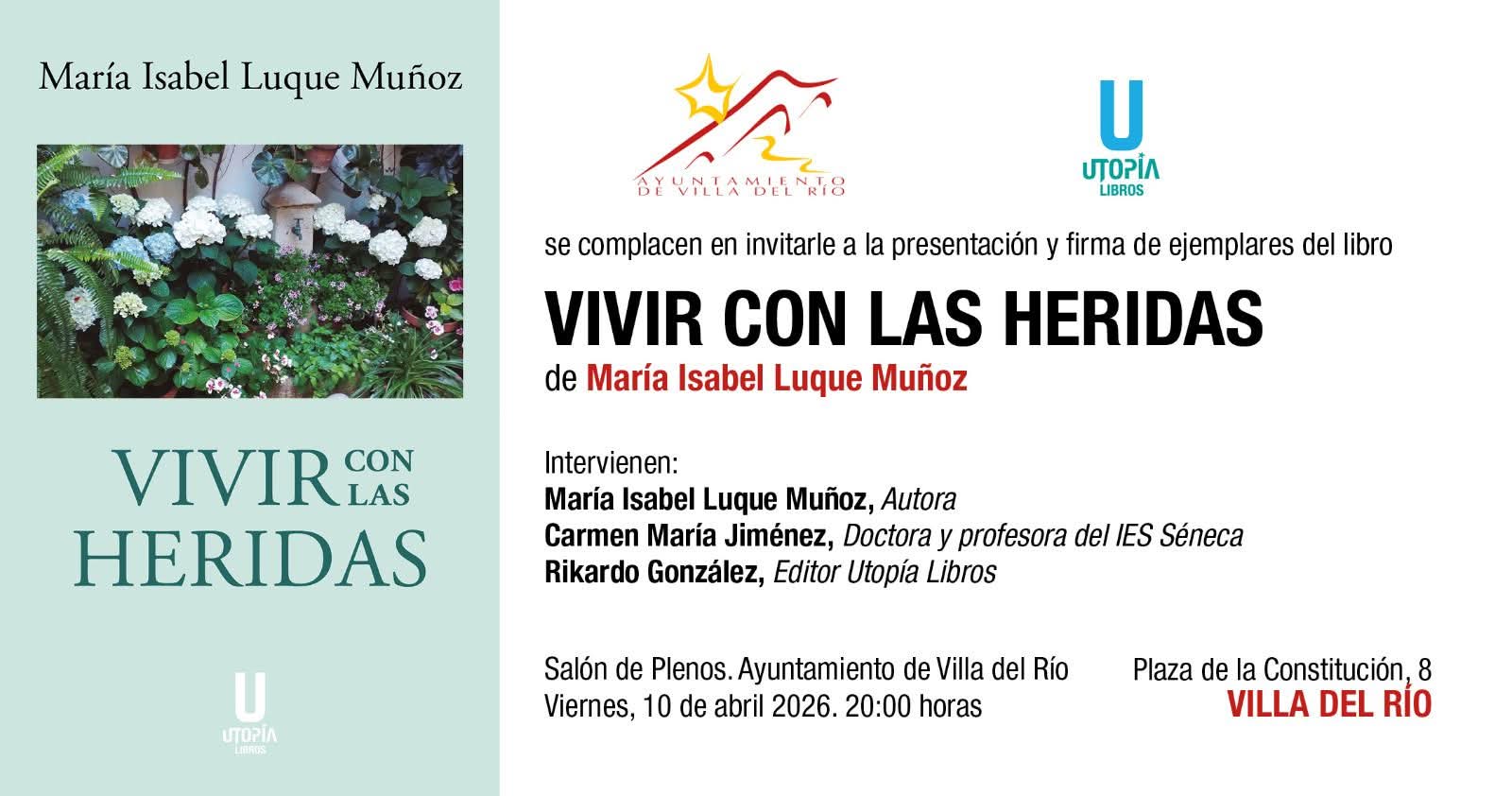 El área de Cultura del Ayuntamiento de Villa del Río informa de la presentación y firma de ejemplares del libro "Vivir con las heridas", obra de la autora María Isabel Luque Muñoz, en un acto cultural abierto a toda la ciudadanía.