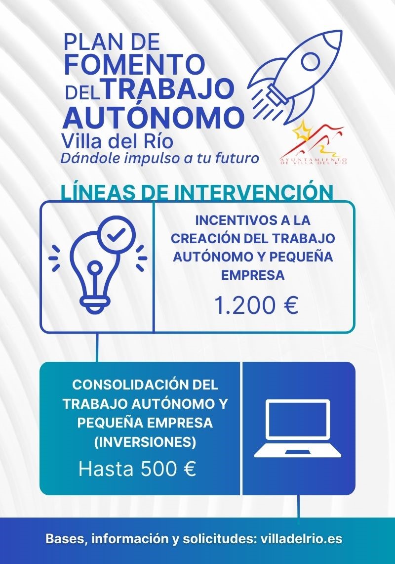 El Ayuntamiento de Villa del Río ha aprobado el Plan de Fomento del Trabajo Autónomo con el fin de seguir apoyando al nuevo autónomo en la puesta en marcha de su nuevo negocio. Es fundamental dicho apoyo al comienzo de un proyecto empresarial, siendo cuando más se necesitan este tipo de incentivos económicos. Por esa razón, se incentiva con 1.200 € la nueva alta de autónomo y con 500 € en el segundo año, para las inversiones que tengan que desarrollar en su comercio o negocio.
