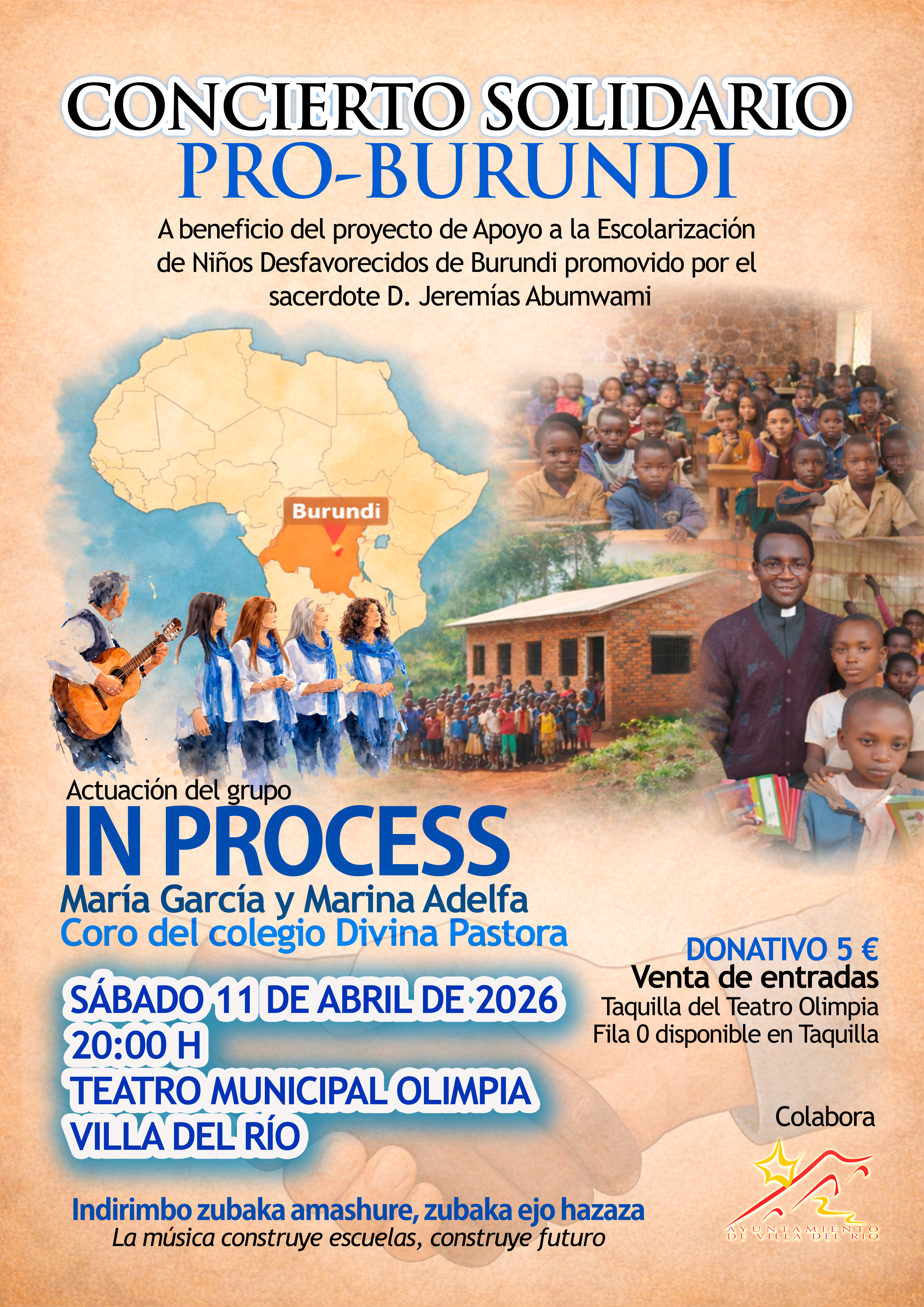 El área de Cultura del Ayuntamiento de Villa del Río colabora con la celebración de un Concierto Solidario Pro-Burundi, organizado a beneficio del proyecto de apoyo a la escolarización de niños desfavorecidos en Burundi, promovido por el sacerdote D. Jeremías Abumwami.