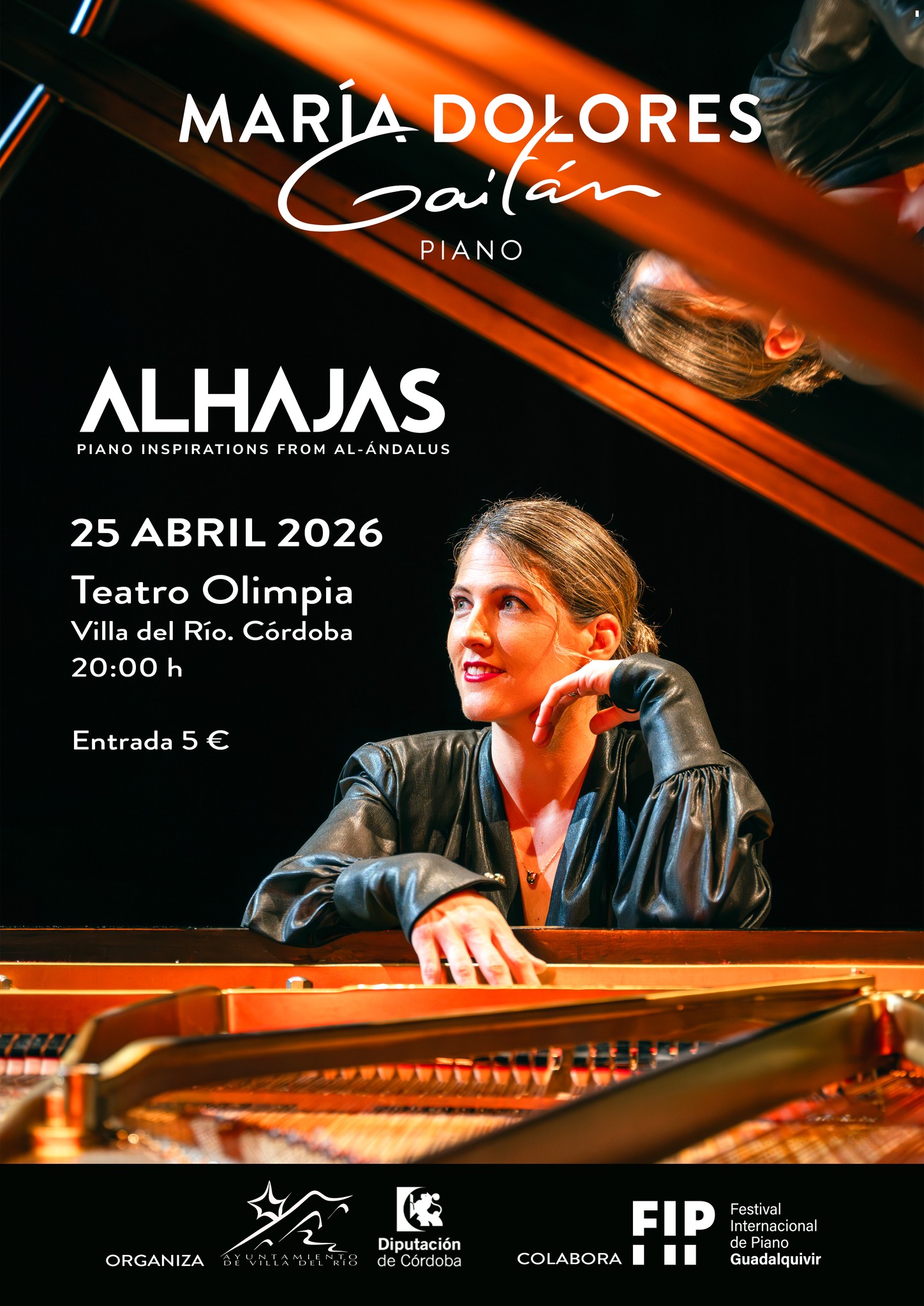 El área de Cultura del Ayuntamiento de Villa del Río organiza, junto a la Diputación de Córdoba, el concierto “Alhajas. Piano inspirations from Al-Ándalus”, a cargo de la pianista villarrense D.ª María Dolores Gaitán, una propuesta musical de gran sensibilidad artística inspirada en el legado cultural andalusí donde colabora el Festival Internacional de Piano Guadalquivir (FIP Guadalquivir).