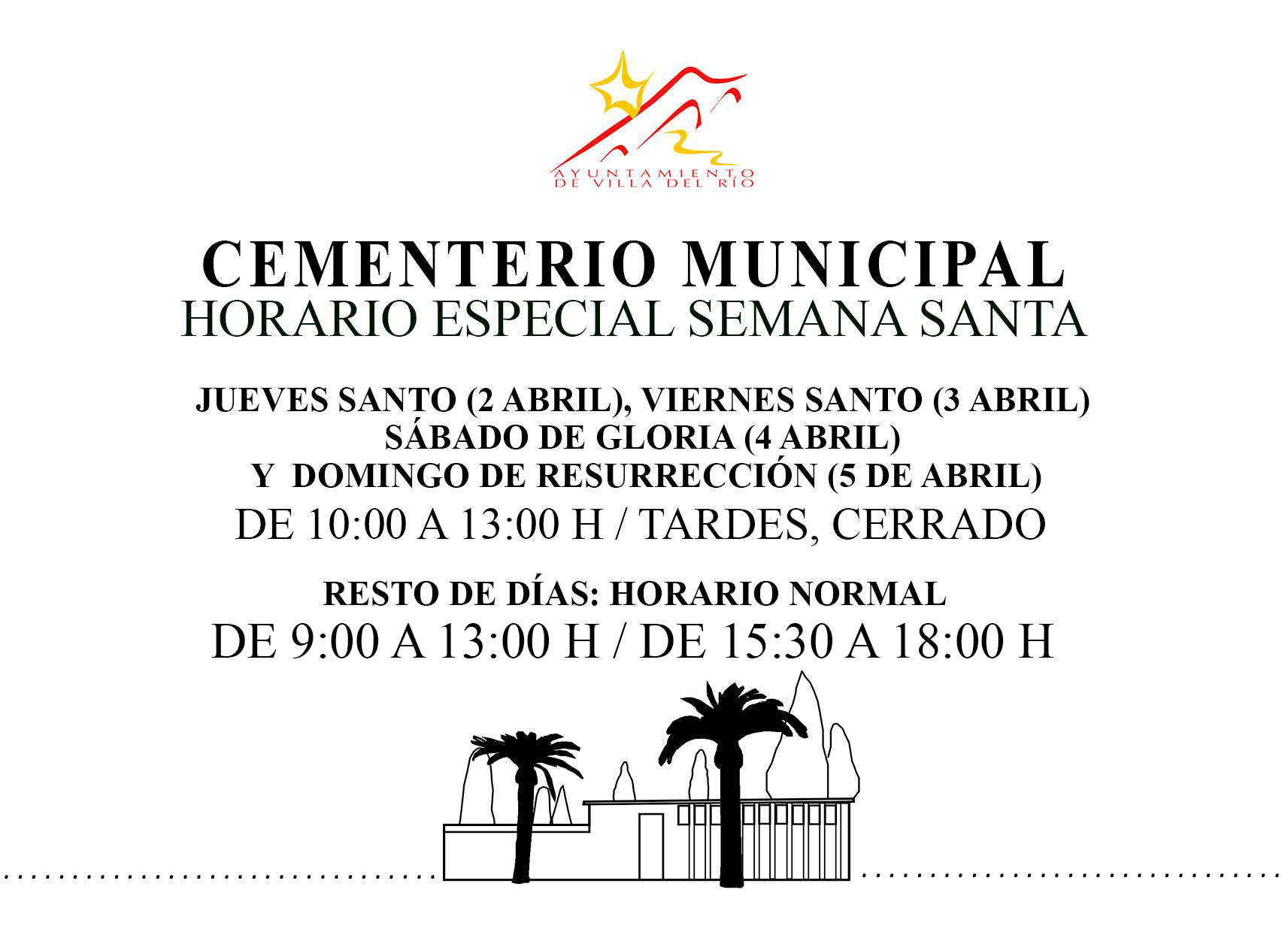 El área de Urbanismo del Ayuntamiento de Villa del Río informa del horario especial de apertura del Cementerio Municipal durante los días festivos de Semana Santa, con el objetivo de facilitar las visitas de vecinos y vecinas en estas fechas señaladas.