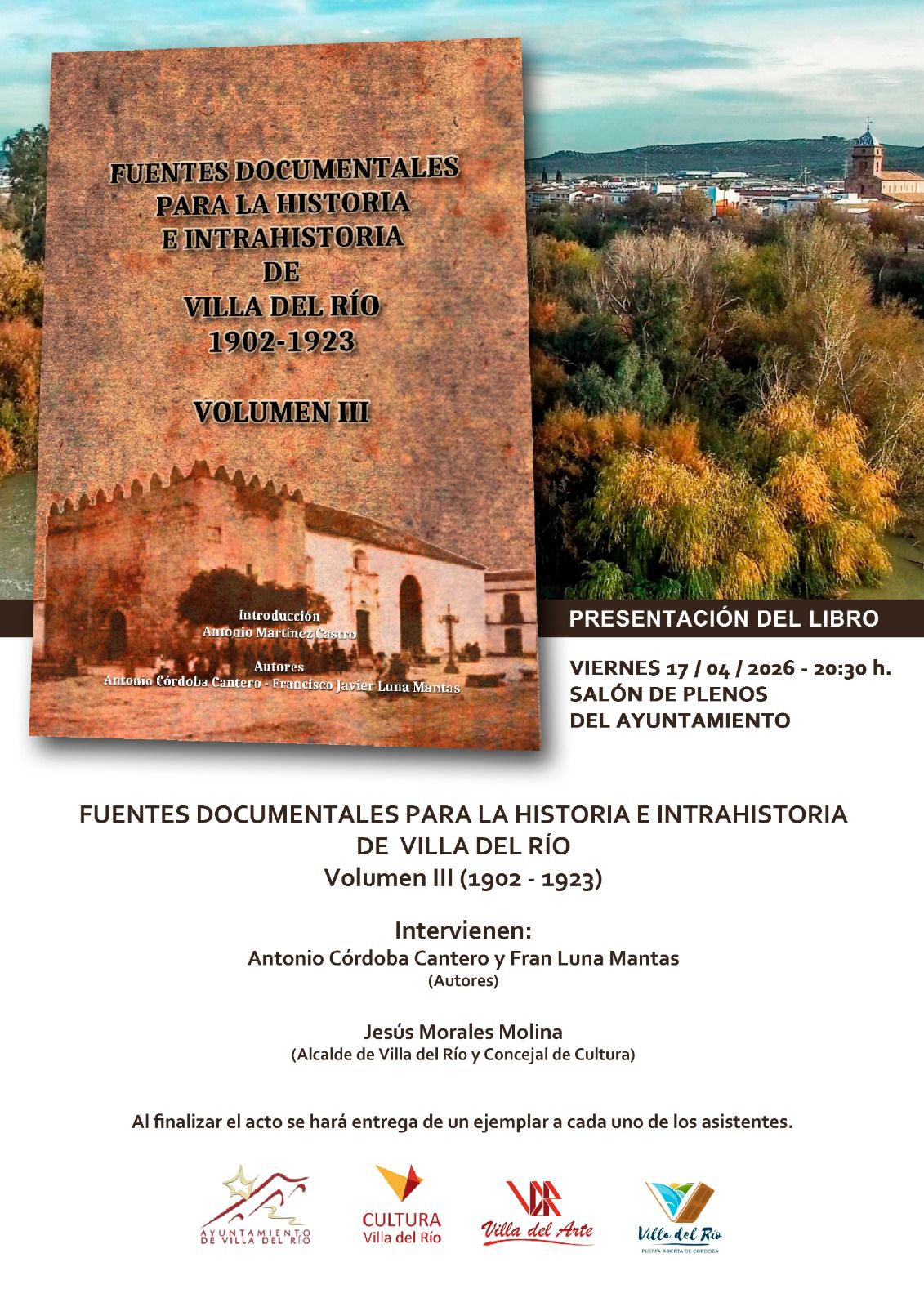 El área de Cultura del Ayuntamiento de Villa del Río organiza la presentación del libro "Fuentes documentales para la historia e intrahistoria de Villa del Río 1902-1923 · Volumen III", de los villarrenses D. Antonio Córdoba Cantero y D. Francisco Javier Luna Mantas, editado y patrocinado por el consistorio e impreso por la empresa local AJR Gráficas, SLU.