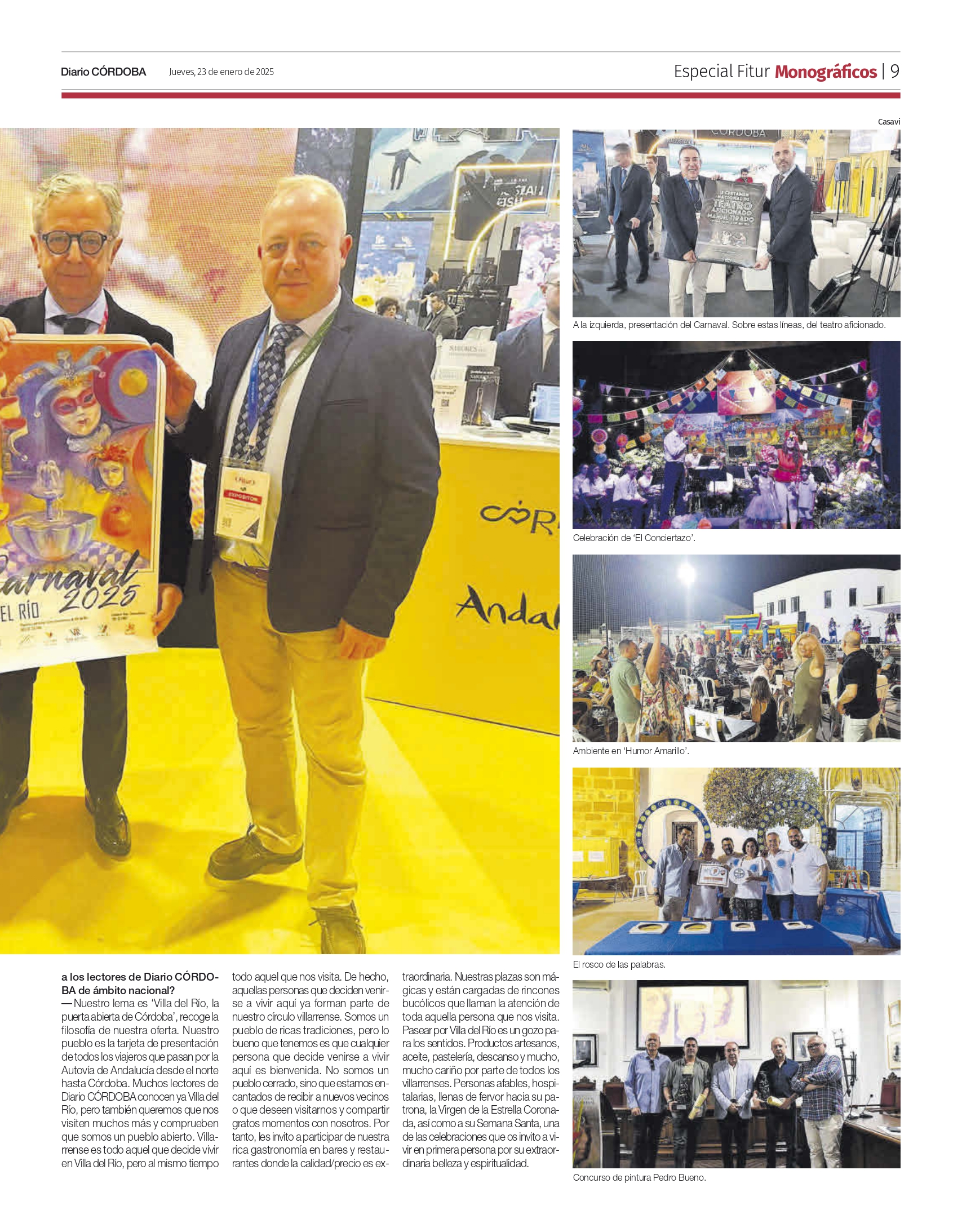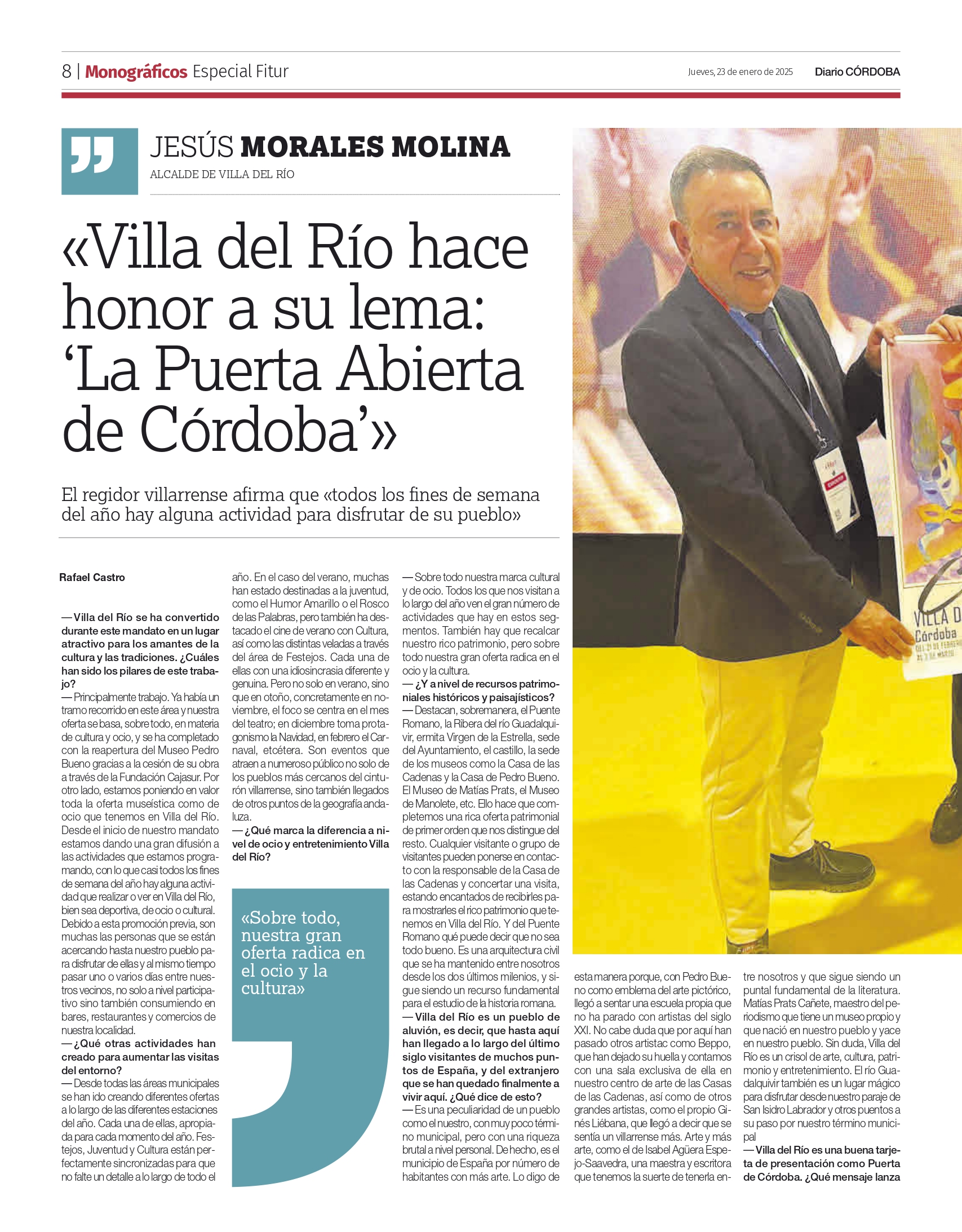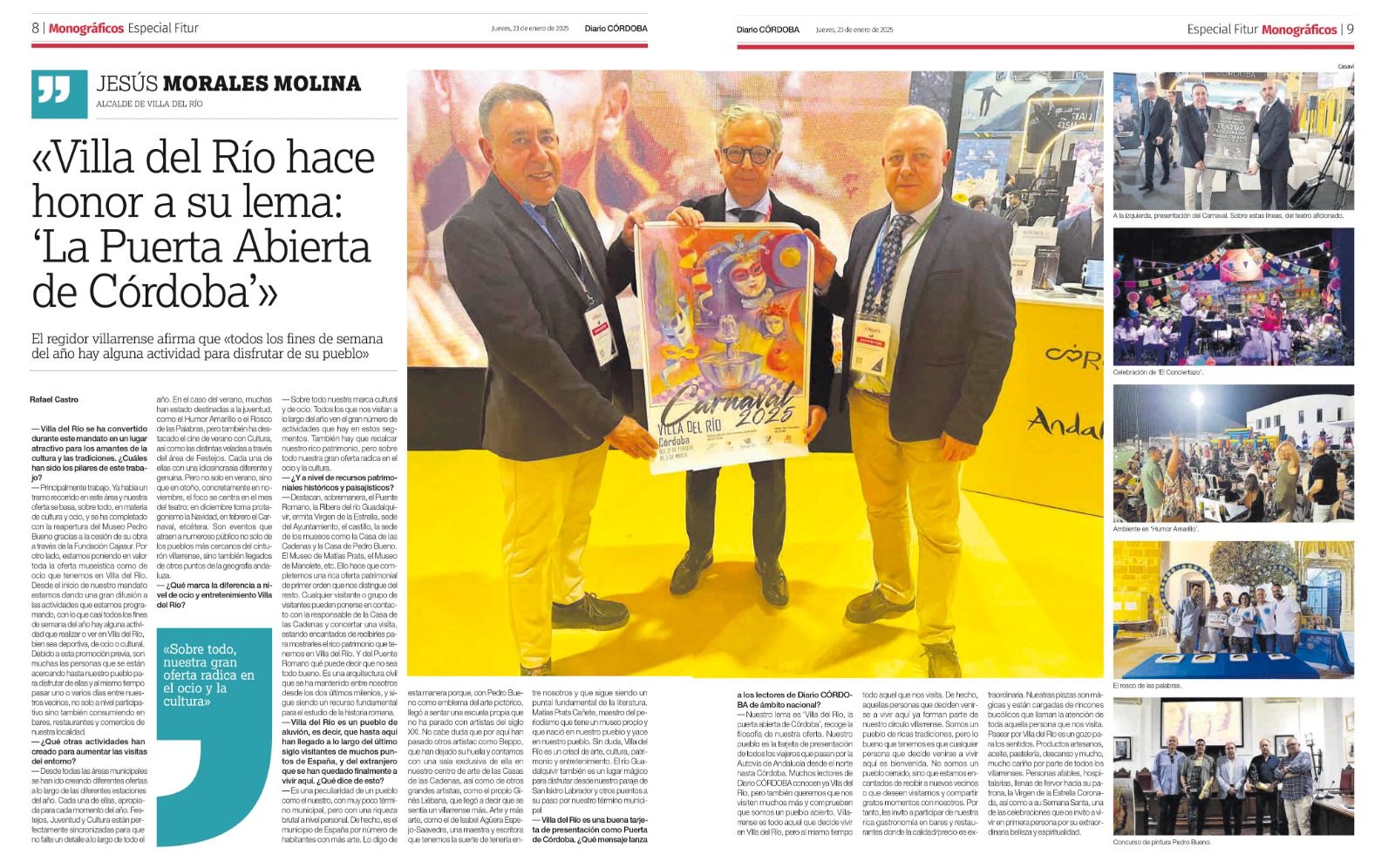 La Edición de El Diario Córdoba del 23 de enero incluye un especial monográfico sobre Turismo con motivo de la presencia de Villa del Río en la Feria Internacional de Turismo, con una entrevista realizada a D. Jesús Morales Molina, alcalde de la localidad.