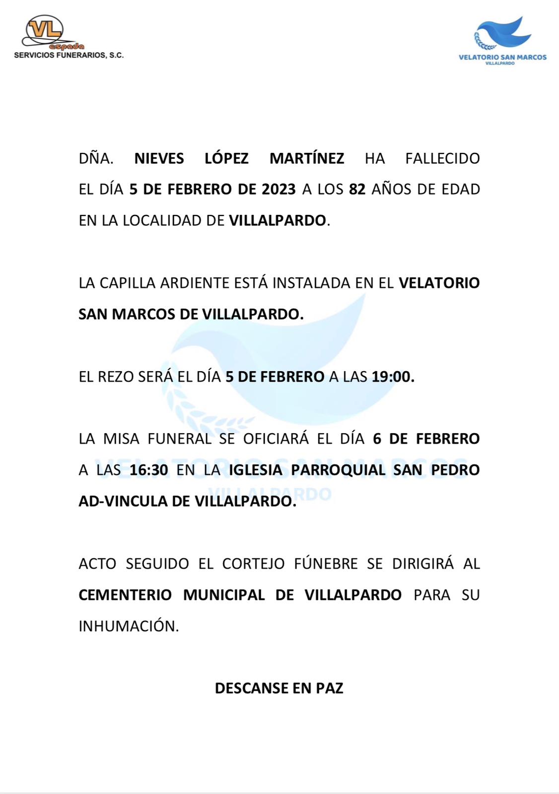 FALLECIMIENTO NIEVES LOPEZ MARTINEZ2023-02-05 18:00:53Info General