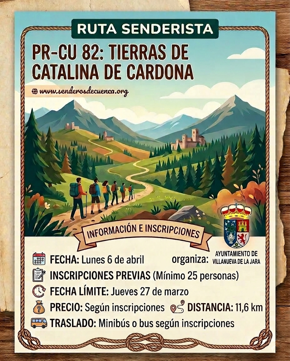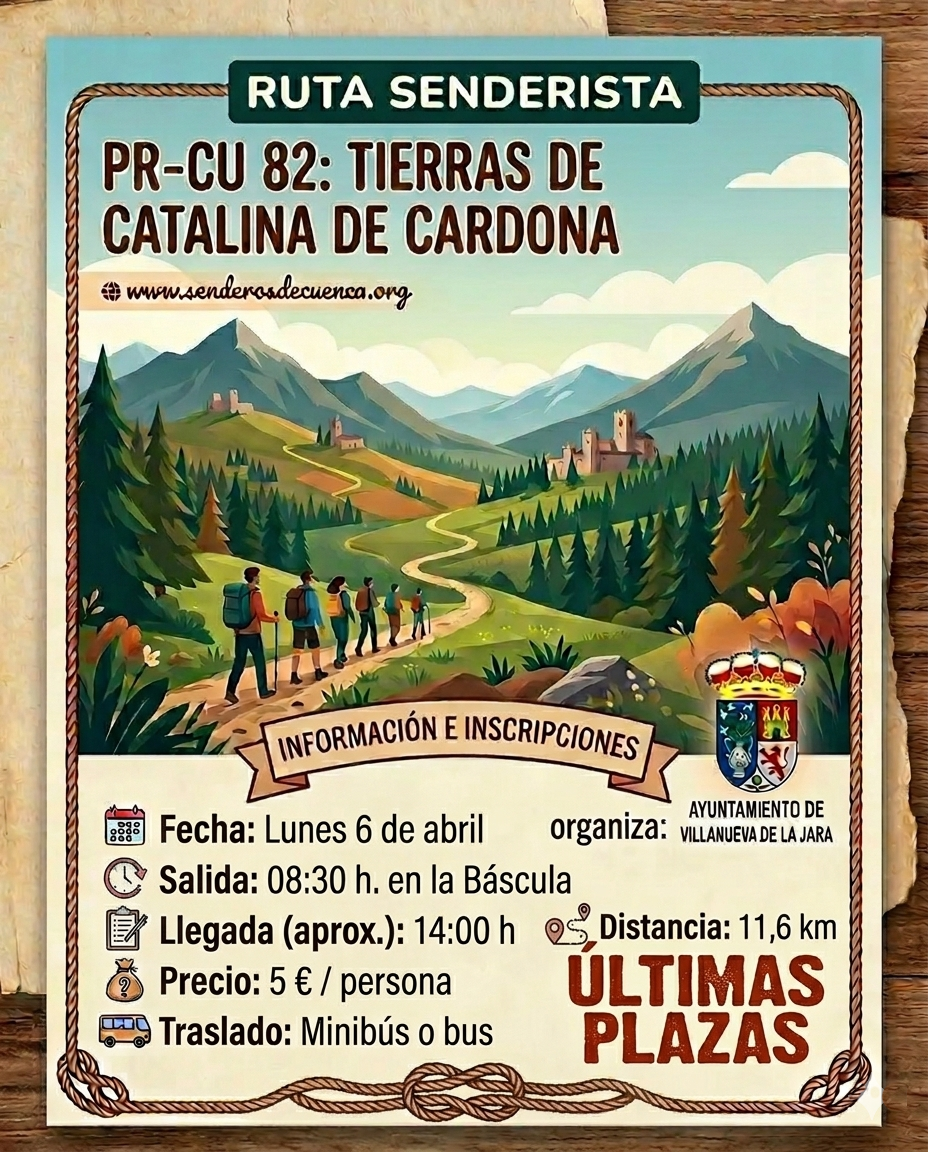 Contenido: Recordamos que quedan muy pocas plazas disponibles para la ruta PR-CU 82 "Tierras de Catalina de Cardona".