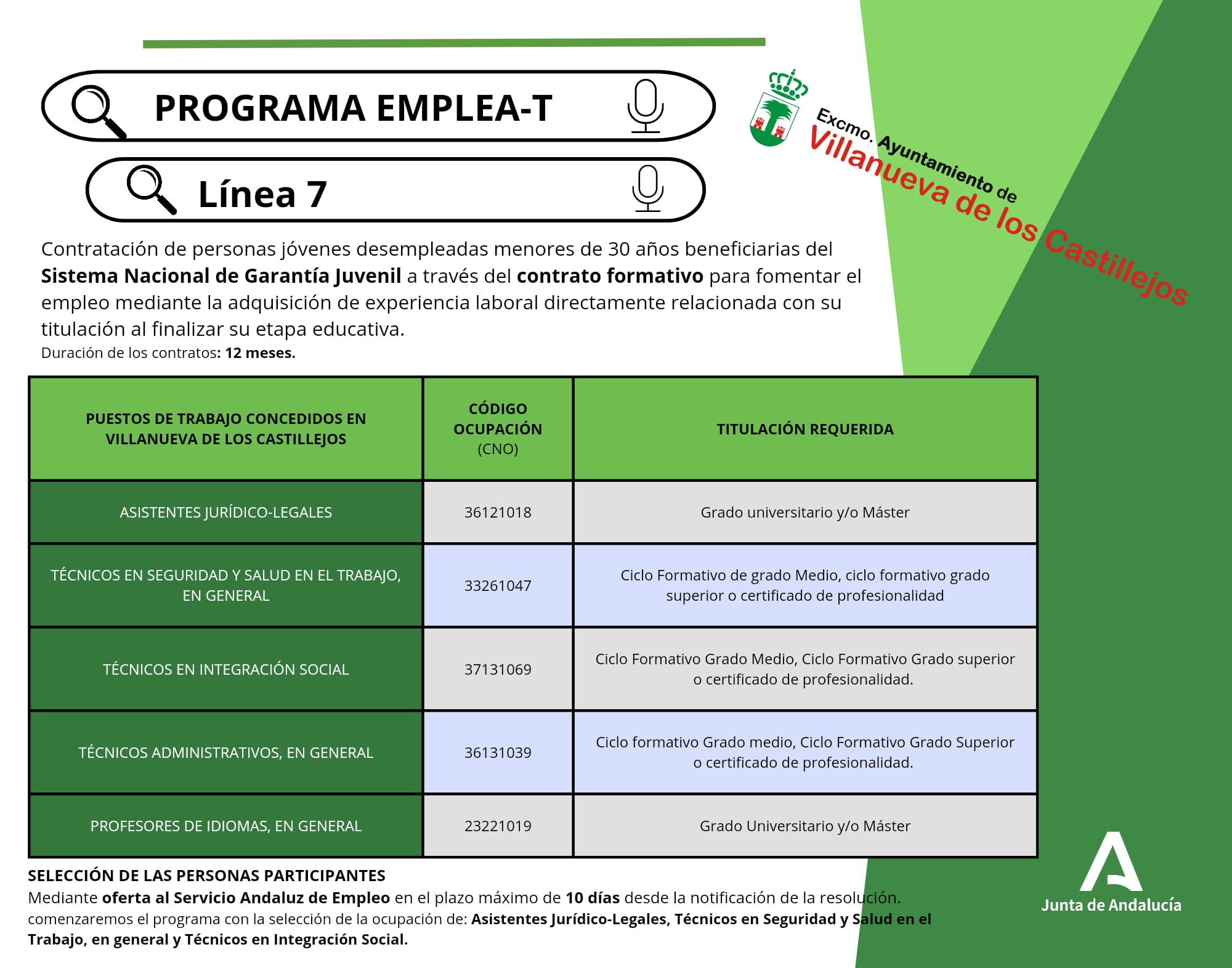 PROGRAMA EMPLEA-T EN VILLANUEVA DE LOS CASTILLEJOS: LÍNEA 72024-12-18 16:11:27EmpleoContratación de jóvenes menores de 30 años.