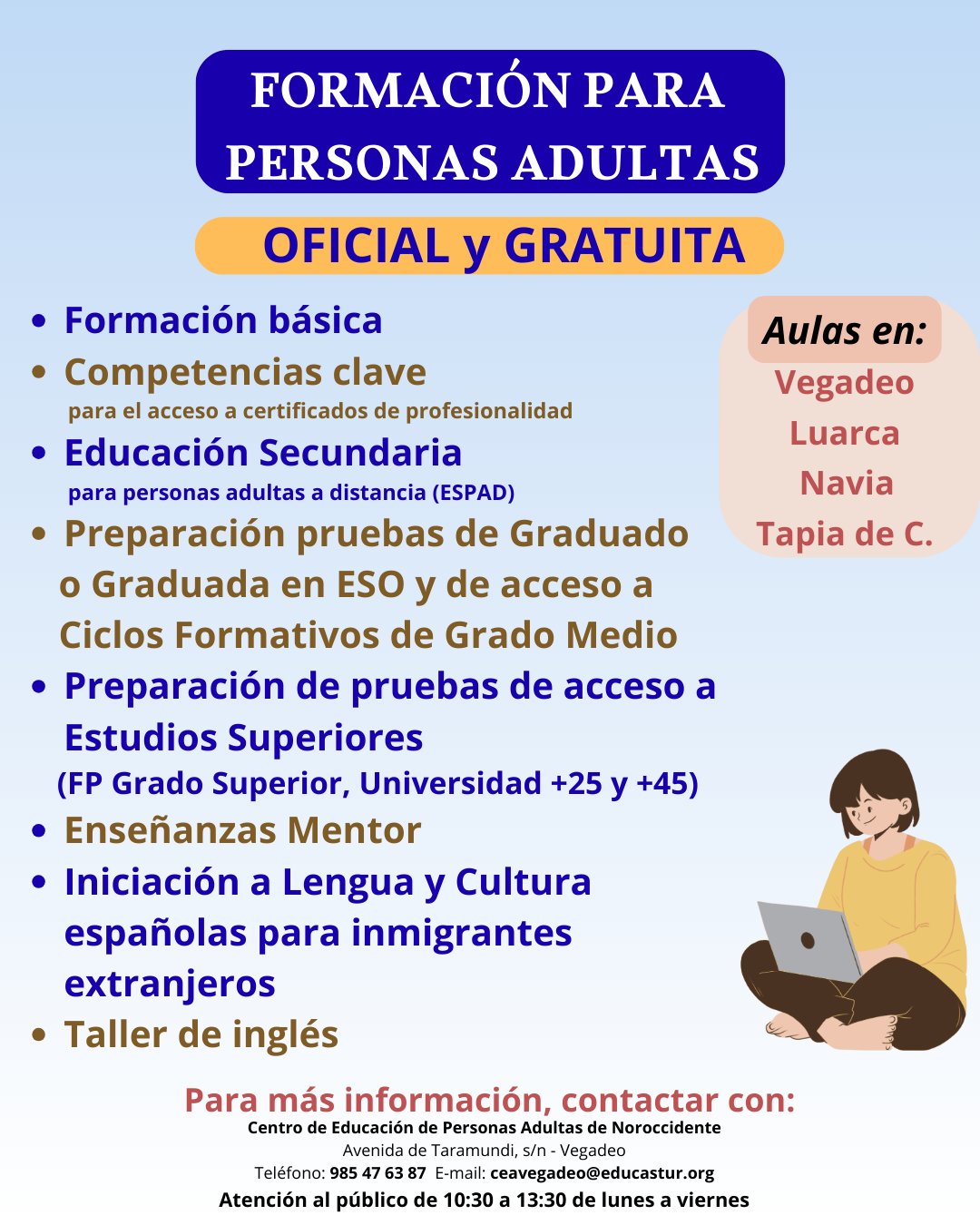 Oferta formativa oficial y gratuita del Centro de Educación de Personas Adultas (CEPA) del Noroccidente ubicado en Vegadeo para el Curso 2025-2026.
