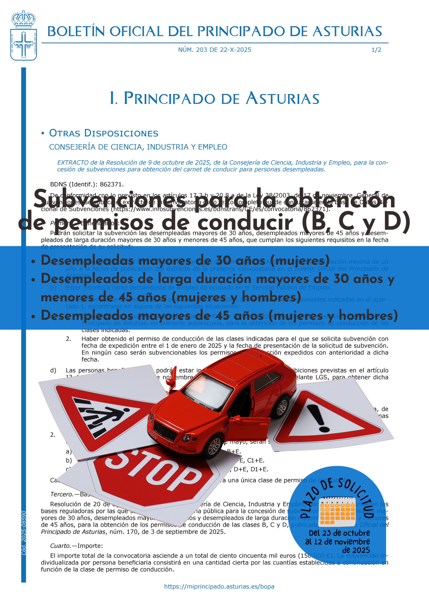 Subvenciones a personas jóvenes asturianas inscritas en el Sistema Nacional de Garantía Juvenil para la obtención de los permisos de conducción de las clases B, C y D durante 2025.