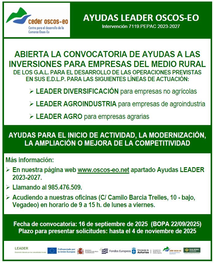 Se informa que en el BOPA de hoy se ha publicado la ampliación del plazo establecido para solicitar ayudas a las inversiones para empresas del medio rural LEADER agro, LEADER agroindustria y LEADER diversificación, hasta el día 4 de noviembre de 2025.