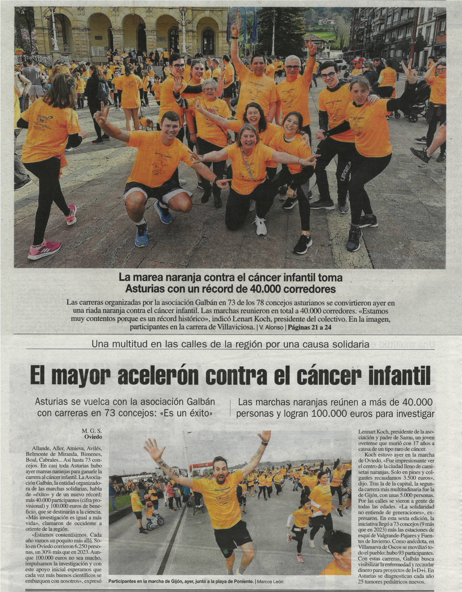 El pasado domingo Villanueva de Oscos se teñía de naranja con Galbán, sumándonos así con 94 personas de todas las edades (93 personas a fecha de la carrera y una donación recibida al día siguiente) a esta gran marea de solidaridad que ha tenido lugar por toda Asturias, con la Carrera Corre con Galbán 2024 contra el Cáncer Infantil.